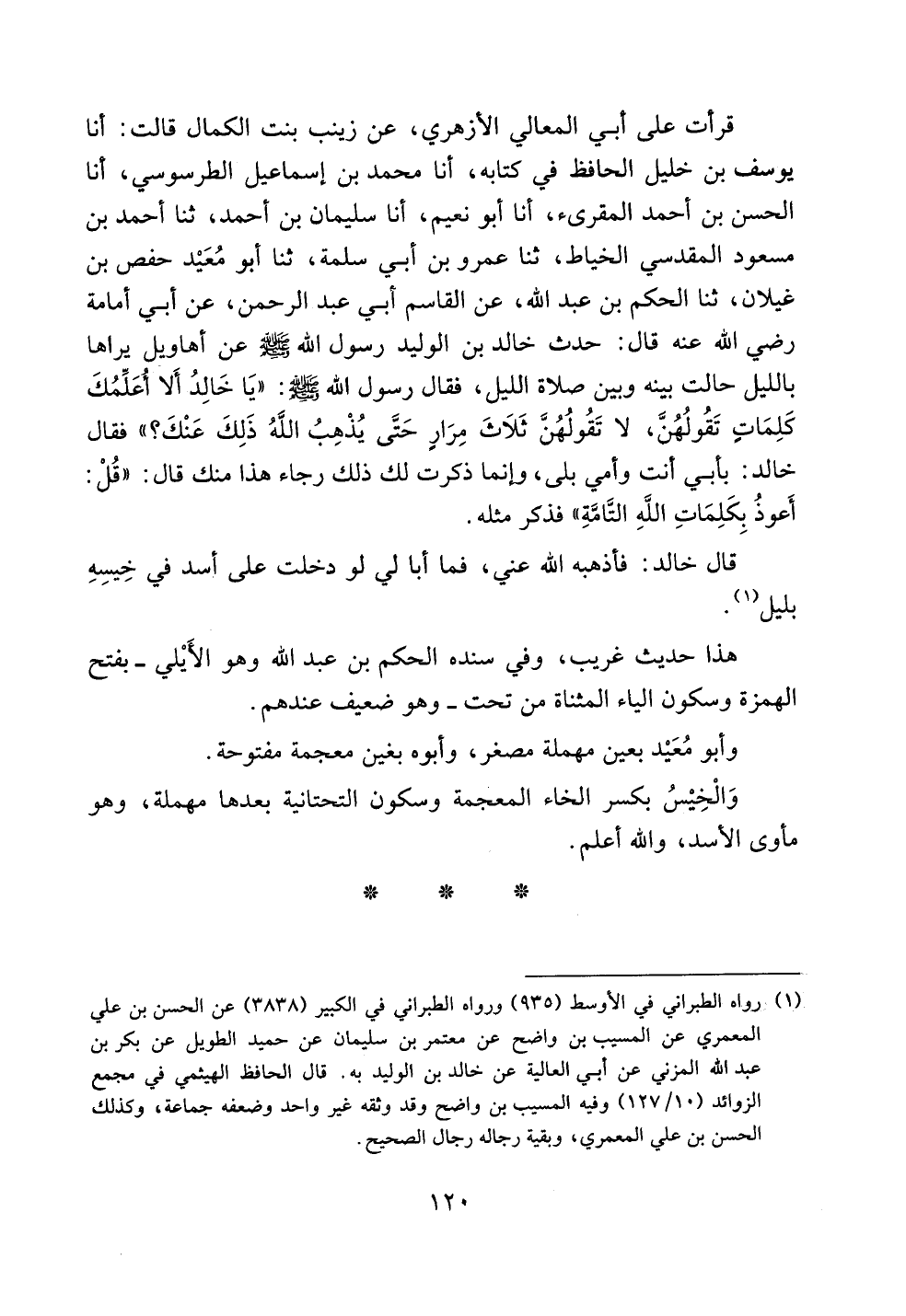 قرأت على أبي المعالي الأزهري، عن زينب بنت الكمال قالت: أنا يوسف بن خليل الحافظ في كتابه، أنا محمد بن إسماعيل الطرسوسي، أنا الحسن بن أحمد المقرئ، أنا أبو نعيم، أنا سليمان بن أحمد، ثنا أحمد بن مسعود المقدسي الخياط، ثنا عمرو بن أبي سلمة، ثنا أبو معيد حفص بن غيلان، ثنا الحكم بن عبد الله، عن القاسم أبي عبد الرحمن، عن أبي أمامة رضي الله عنه قال: حدث خالد بن الوليد رسول الله صلى الله عليه وسلم عن أهاويل يراها بالليل حالت بينه وبين صلاة الليل، فقال رسول الله صلى الله عليه وسلم: ((يا خالد ألا أعلمك كلماتٍ تقولهن، لا تقولهن ثلاث مرار حتى يذهب الله ذلك عنك؟)) فقال خالد: بأبي أنت وأمي بلى، وإنما ذكرت لك ذلك رجاء هذا منك قال: ((قل: أعوذ بكلمات الله التامة)) فذكر مثله.