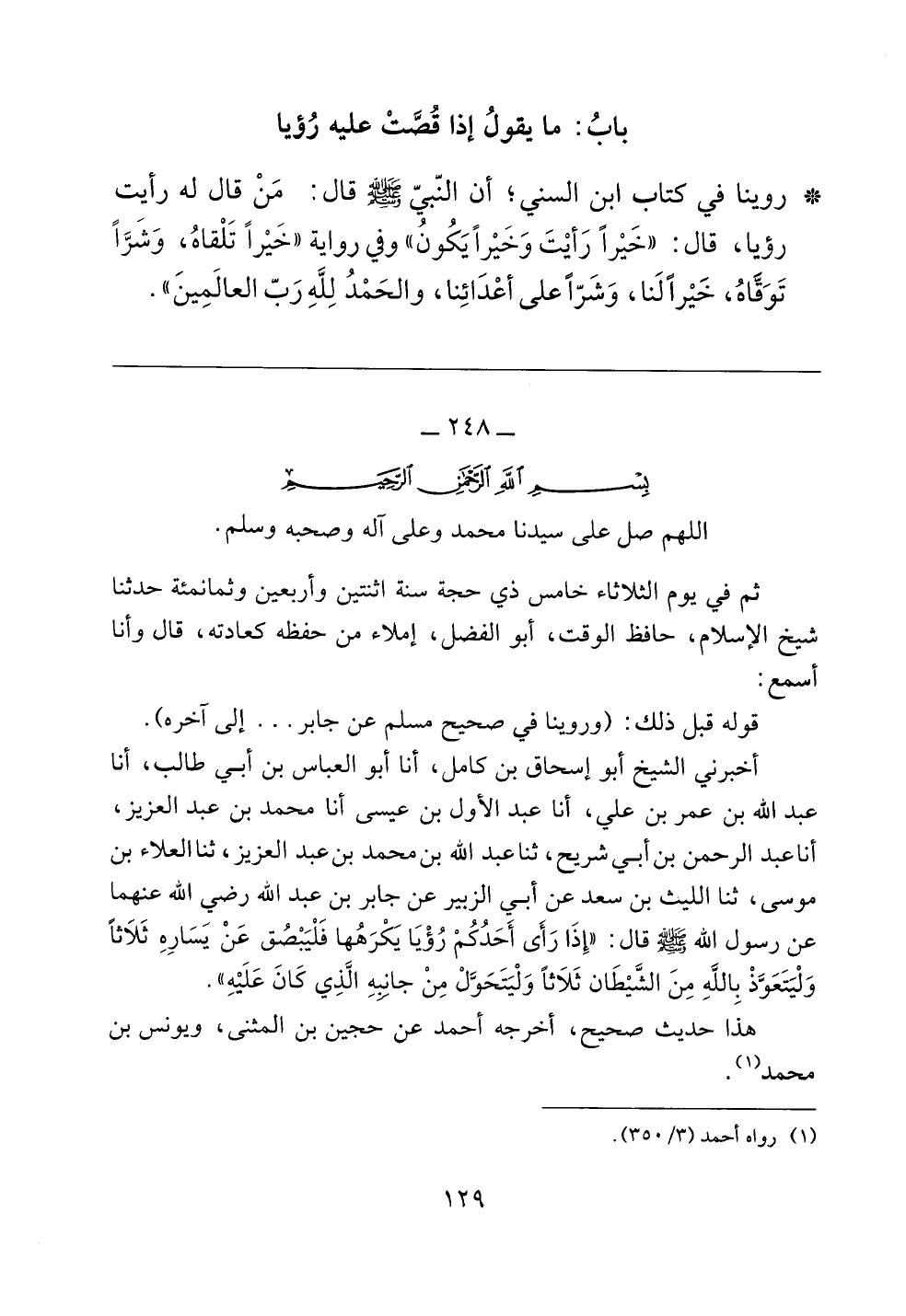 أخبرني الشيخ أبو إسحاق بن كامل، أنا أبو العباس بن أبي طالب، أنا عبد الله بن عمر بن علي، أنا عبد الأول بن عيسى أنا محمد بن عبد العزيز، أنا عبد الرحمن بن أبي شريح، ثنا عبد الله بن محمد بن عبد العزيز، ثنا العلاء بن موسى، ثنا الليث بن سعد عن أبي الزبير عن جابر بن عبد الله رضي الله عنهما عن رسول الله صلى الله عليه وسلم قال: ((إذا رأى أحدكم رؤيا يكرهها فليبصق عن يساره ثلاثاً وليتعوذ بالله من الشيطان ثلاثاً وليتحول من جانبه الذي كان عليه)).