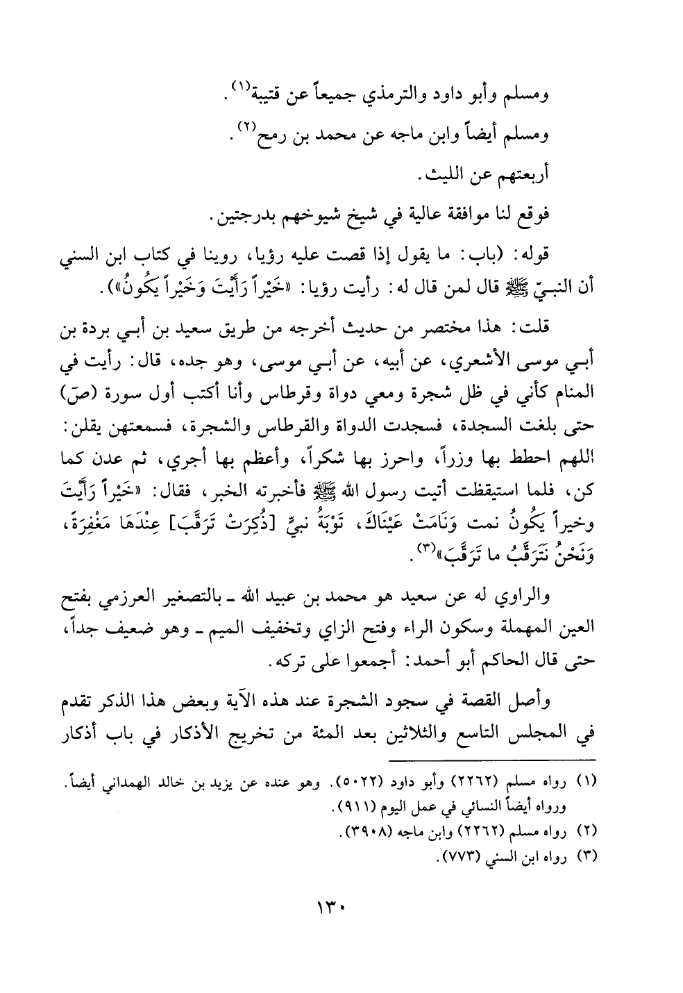 قلت: هذا مختصر من حديث أخرجه من طريق سعيد بن أبي بردة بن أبي موسى الأشعري، عن أبيه، عن أبي موسى، وهو جده، قال: رأيت في المنام كأني في ظل شجرة ومعي دواة وقرطاس وأنا أكتب أول سورة (ص) حتى بلغت السجدة، فسجدت الدواة والقرطاس والشجرة، فسمعتهن يقلن: اللهم احطط بها وزراً، واحرز بها شكراً، وأعظم بها أجري، ثم عدن كما كن، فلما استيقظت أتيت رسول الله صلى الله عليه وسلم فأخبرته الخبر، فقال: ((خيراً رأيت وخيراً يكون نمت ونامت عيناك، توبة نبيٍ [ذكرت ترقب] عندها مغفرة، ونحن نترقب ما ترقب)).