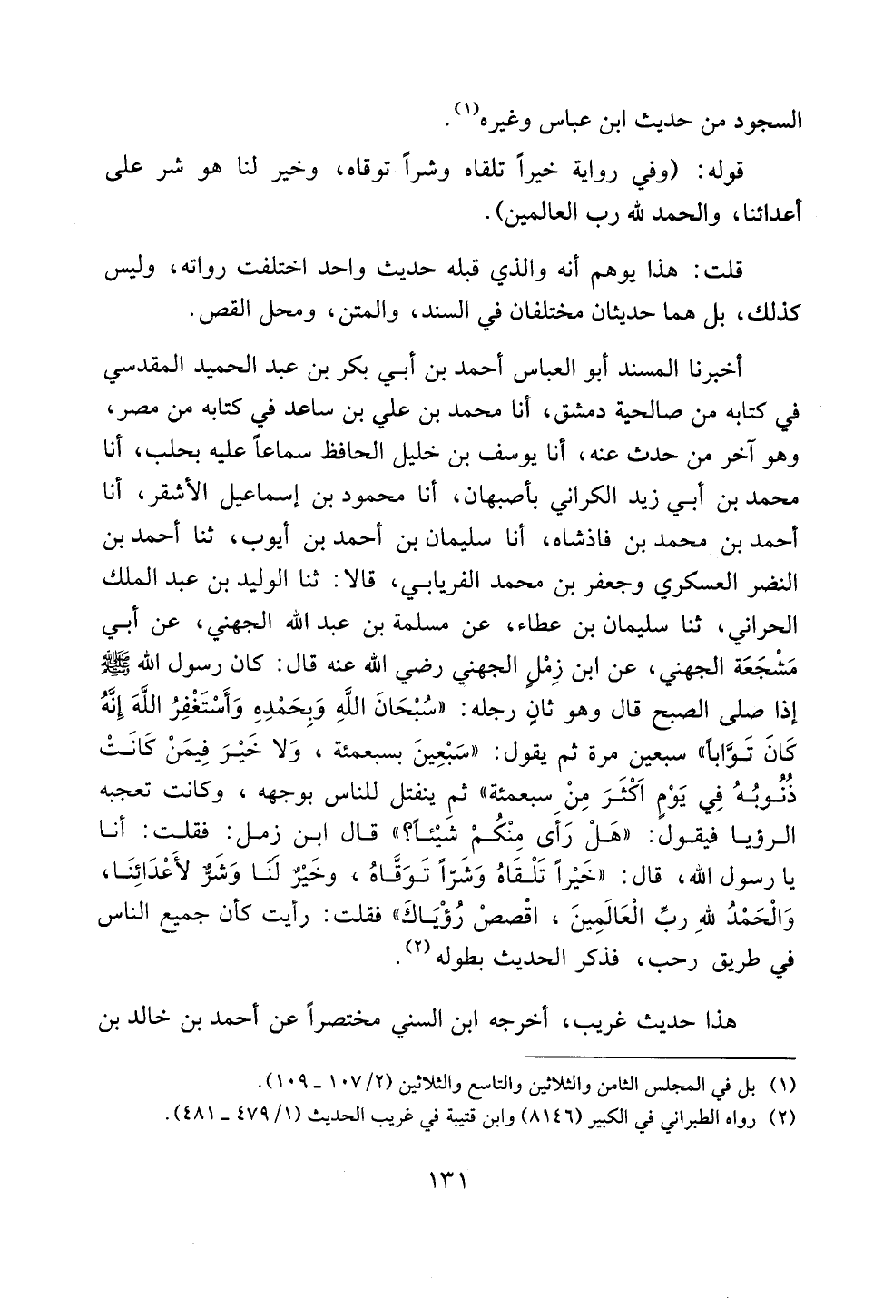 أخبرنا المسند أبو العباس أحمد بن أبي بكر بن عبد الحميد المقدسي في كتابه من صالحية دمشق، أنا محمد بن علي بن ساعد في كتابه من مصر، وهو آخر من حدث عنه، أنا يوسف بن خليل الحافظ سماعاً عليه بحلب، أنا محمد بن أبي زيد الكراني بأصبهان، أنا محمود بن إسماعيل الأشقر، أنا أحمد بن محمد بن فاذشاه، أنا سليمان بن أحمد بن أيوب، ثنا أحمد بن النضر العسكري وجعفر بن محمد الفريابي، قالا: ثنا الوليد بن عبد الملك الحراني، ثنا سليمان بن عطاء، عن مسلمة بن عبد الله الجهني، عن أبي مشجعة الجهني، عن ابن زمل الجهني رضي الله عنه قال: كان رسول الله صلى الله عليه وسلم إذا صلى الصبح قال وهو ثانٍ رجله: ((سبحان الله وبحمده وأستغفر الله إنه كان تواباً)) سبعين مرة ثم يقول: ((سبعين بسبعمئة، ولا خير فيمن كانت ذنوبه في يومٍ أكثر من سبعمئة)) ثم ينفتل للناس بوجهه، وكانت تعجبه الرؤيا فيقول: ((هل رأى منكم شيئاً؟)) قال ابن زمل: فقلت: أنا يا رسول الله، قال: ((خيراً تلقاه وشراً توقاه، وخيرٌ لنا وشرٌ لأعدائنا، والحمد لله رب العالمين، اقصص رؤياك)) فقلت: رأيت كأن جميع الناس في طريق رحب، فذكر الحديث بطوله.
