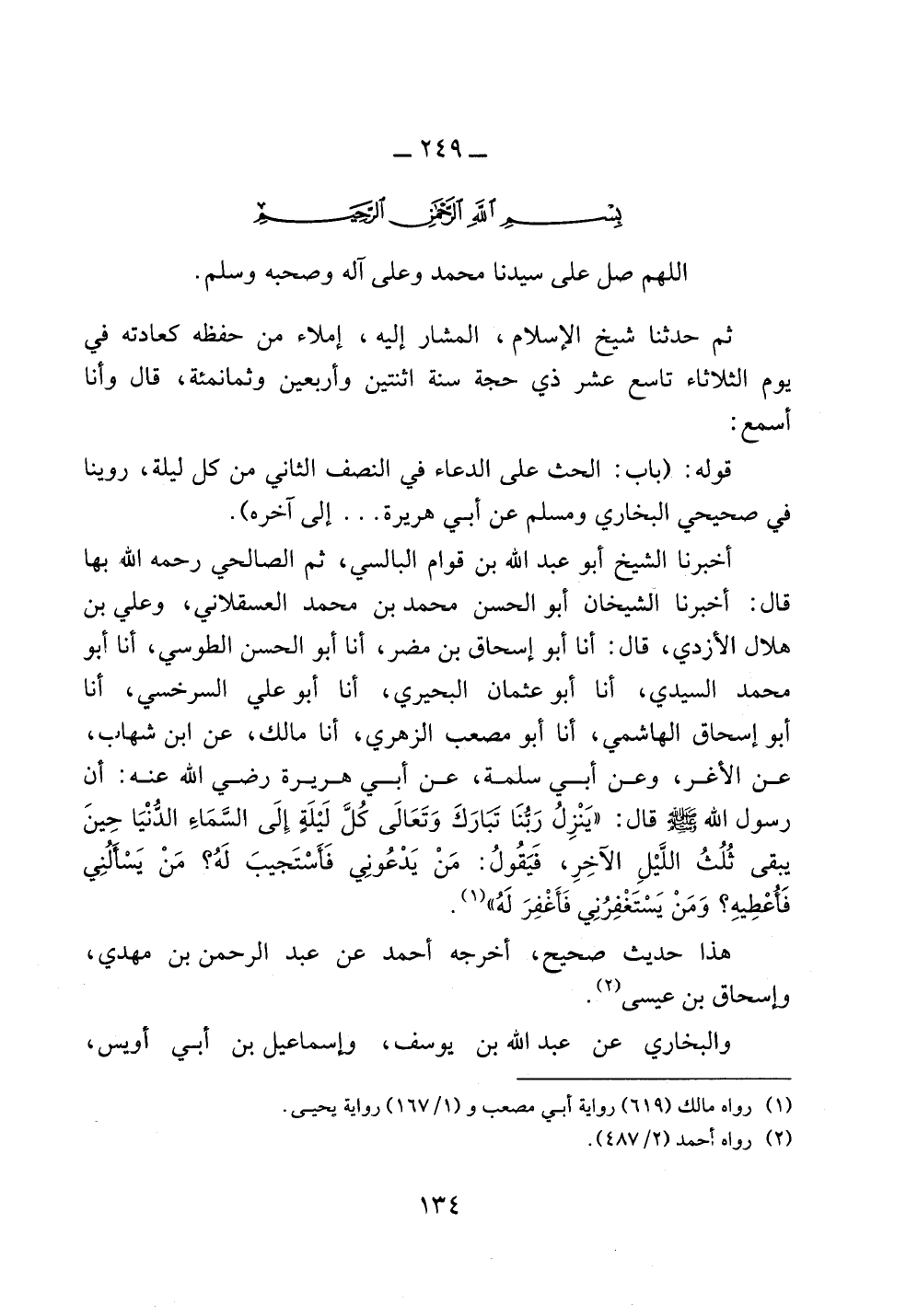 أخبرنا الشيخ أبو عبد الله بن قوام البالسي، ثم الصالحي رحمه الله بها قال: أخبرنا الشيخان أبو الحسن محمد بن محمد العسقلاني، وعلي بن هلال الأزدي، قال: أنا أبو إسحاق بن مضر، أنا أبو الحسن الطوسي، أنا أبو محمد السيدي، أنا أبو عثمان البحيري، أنا أبو علي السرخسي، أنا أبو إسحاق الهاشمي، أنا أبو مصعب الزهري، أنا مالك، عن ابن شهاب، عن الأغر، وعن أبي سلمة، عن أبي هريرة رضي الله عنه: أن رسول الله صلى الله عليه وسلم: قال: ((ينزل ربنا تبارك وتعالى كل ليلةٍ إلى السماء الدنيا حين يبقى ثلث الليل الآخر، فيقول: من يدعوني فأستجيب له؟ من يسألني فأعطيه؟ ومن يستغفرني فأغفر له)).