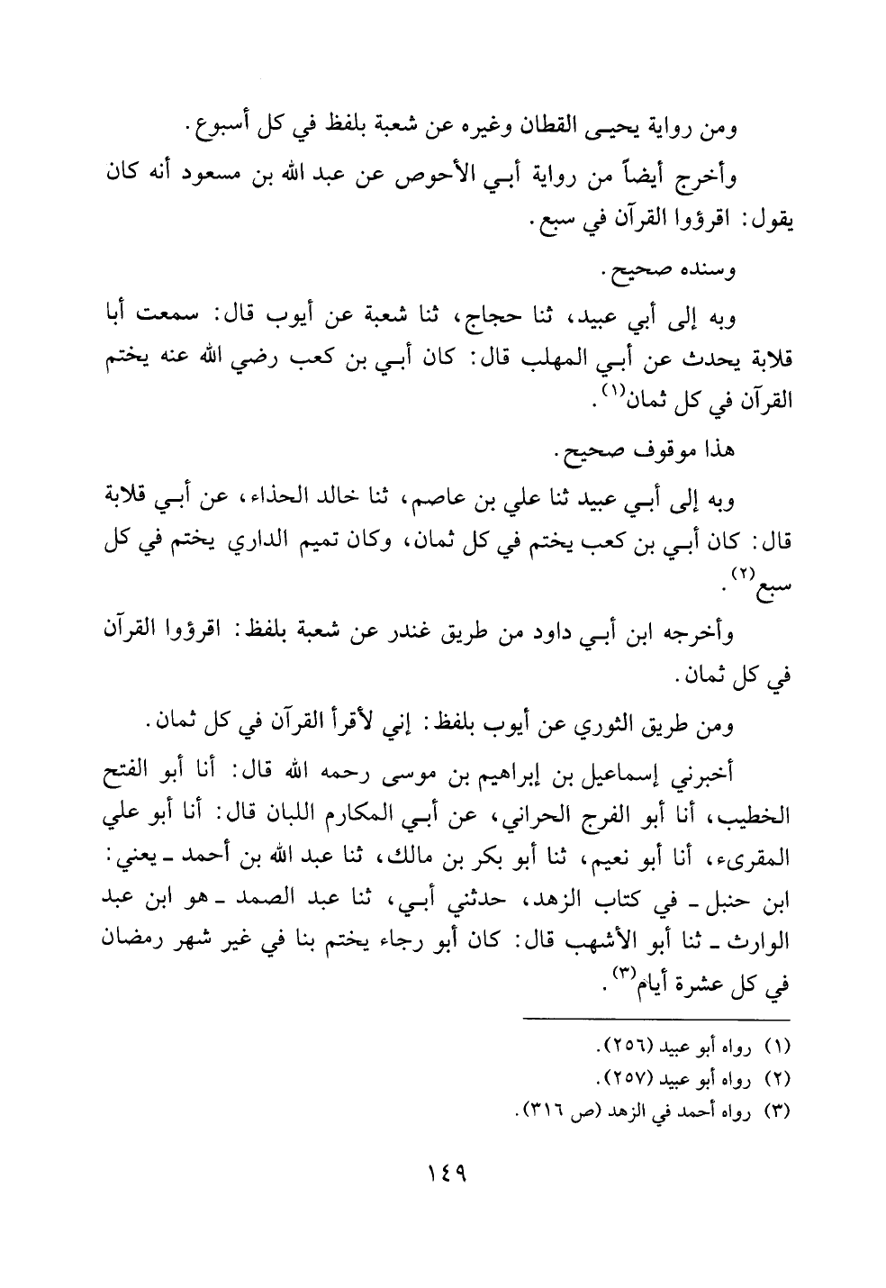 وبه إلى أبي عبيد، ثنا حجاج، ثنا شعبة عن أيوب قال: سمعت أبا قلابة يحدث عن أبي المهلب قال: كان أبي بن كعب رضي الله عنه يختم القرآن في كل ثمان.