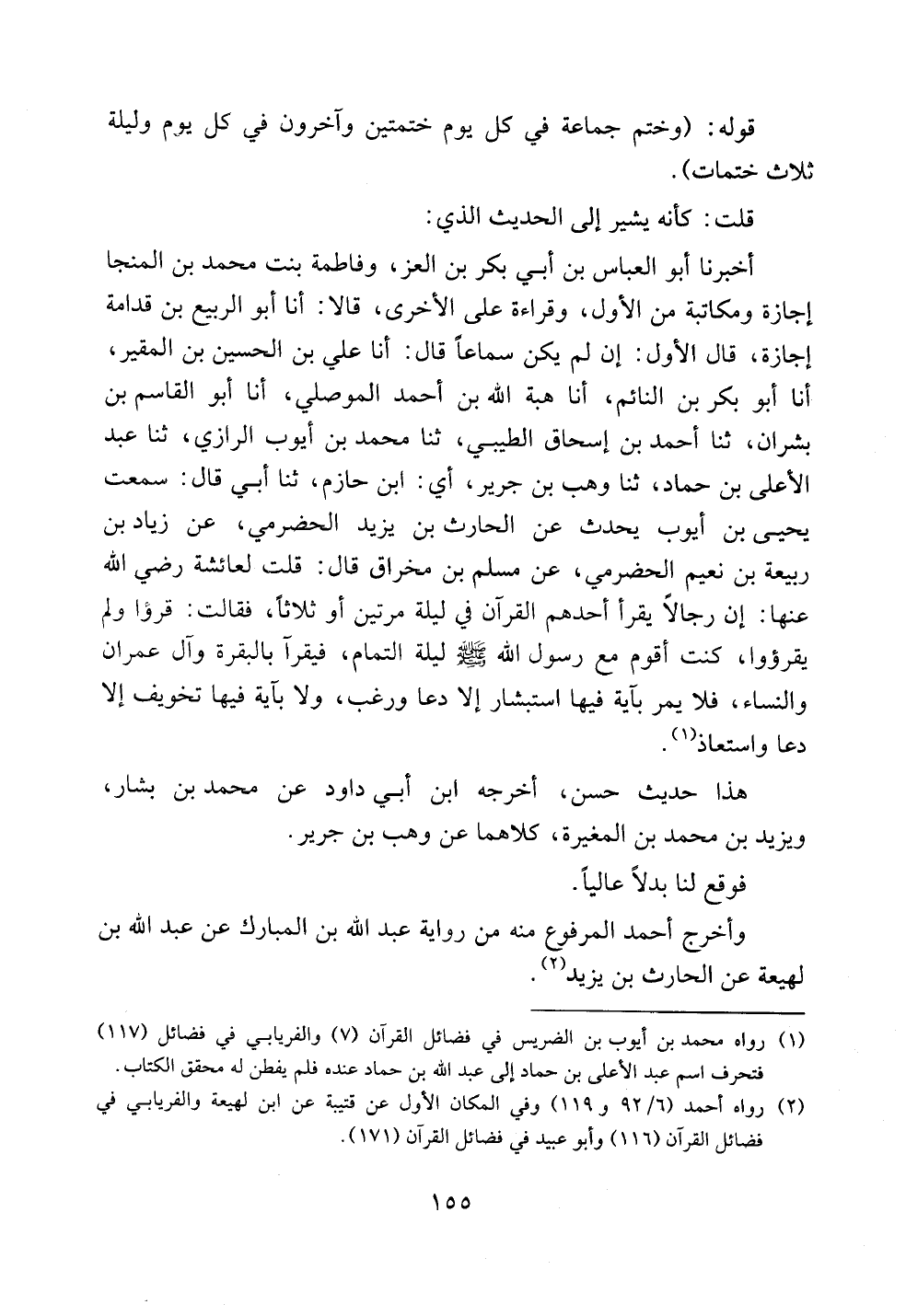 أخبرنا أبو العباس بن أبي بكر بن العز، وفاطمة بنت محمد بن المنجا إجازة ومكاتبة من الأول، وقراءة على الأخرى، قالا: أنا أبو الربيع بن قدامة إجازة قال الأول: إن لم يكن سماعاً قال: أنا علي بن الحسين بن المقير، أنا أبو بكر بن النائم، أنا هبة الله بن أحمد الموصلي، أنا أبو القاسم بن بشران، ثنا أحمد بن إسحاق الطيبي، ثنا محمد بن أيوب الرازي، ثنا عبد الأعلى بن حماد، ثنا وهب بن جرير، أي: ابن حازم، ثنا أبي قال: سمعت يحيى بن أيوب يحدث عن الحارث بن يزيد الحضرمي، عن زياد بن ربيعة بن نعيم الحضرمي، عن مسلم بن مخراق قال: قلت لعائشة رضي الله عنها: إن رجالاً يقرأ أحدهم القرآن في ليلة مرتين أو ثلاثاً، فقالت: قرؤا ولم يقرؤوا، كنت أقوم مع رسول الله صلى الله عليه وسلم ليلة التمام، فيقرأ بالبقرة وآل عمران والنساء، فلا يمر بآية فيها استبشار إلا دعا ورغب، ولا بآية فيها تخويف إلا دعا واستعاذ.