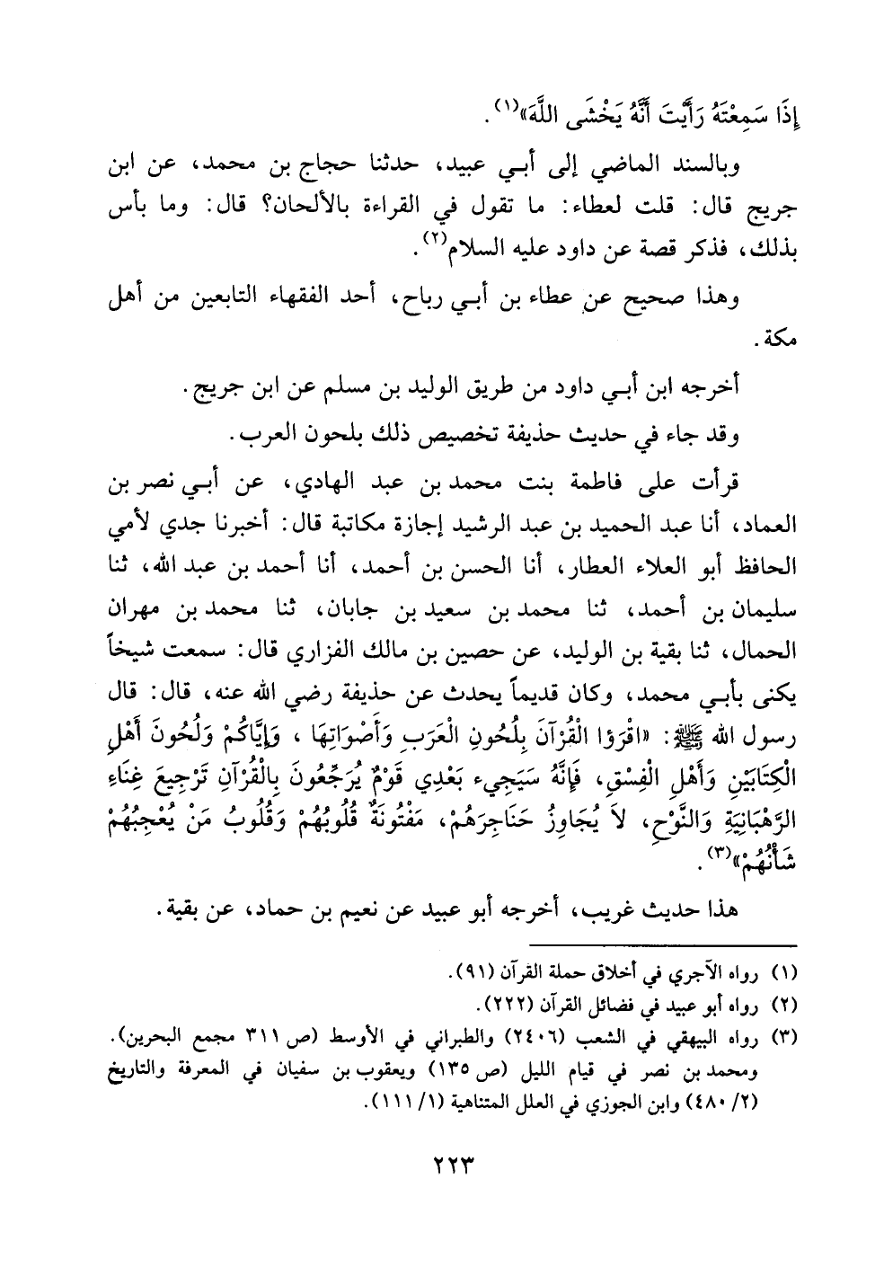 وبالسند الماضي إلى أبي عبيد، حدثنا حجاج بن محمد، عن ابن جريج قال: قلت لعطاء: ما تقول في القراءة بالألحان؟ قال: وما بأس بذلك، فذكر قصة عن داود عليه السلام.