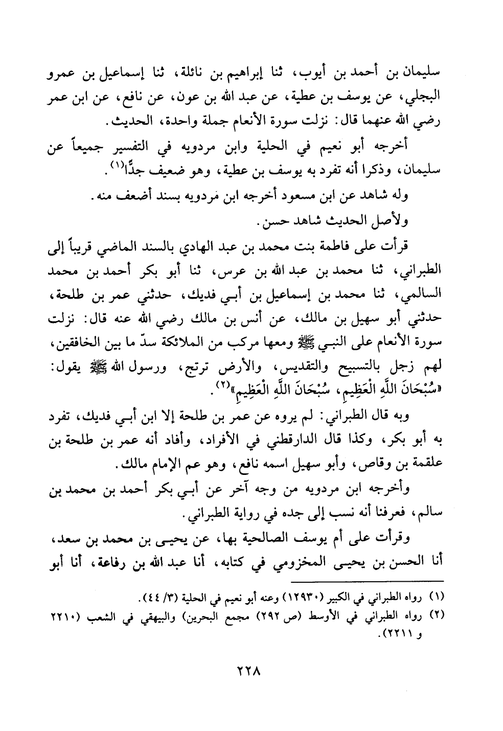 قرأت على فاطمة بنت محمد بن عبد الهادي بالسند الماضي قريباً إلى الطبراني، ثنا محمد بن عبد الله بن عرس، ثنا أبو بكر أحمد بن محمد السالمي، ثنا محمد بن إسماعيل بن أبي فديك، حدثني عمر بن طلحة، حدثني أبو سهيل بن مالك، عن أنس بن مالك رضي الله عنه قال: نزلت سورة الأنعام على النبي صلى الله عليه وسلم ومعها مركب من الملائكة سد ما بين الخافقين، لهم زجل بالتسبيح والتقديس، والأرض ترتج، ورسول الله صلى الله عليه وسلم يقول: ((سبحان الله العظيم، سبحان الله العظيم)).