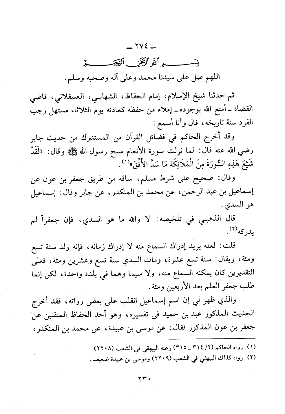 ثم حدثنا شيخ الإسلام، إمام الحفاظ، الشهابي، العسقلاني، قاضي القضاة،-أمتع الله بوجوده- إملاء من حفظه كعادته يوم الثلاثاء مستهل رجب الفرد سنة تاريخه، قال وأنا أسمع: