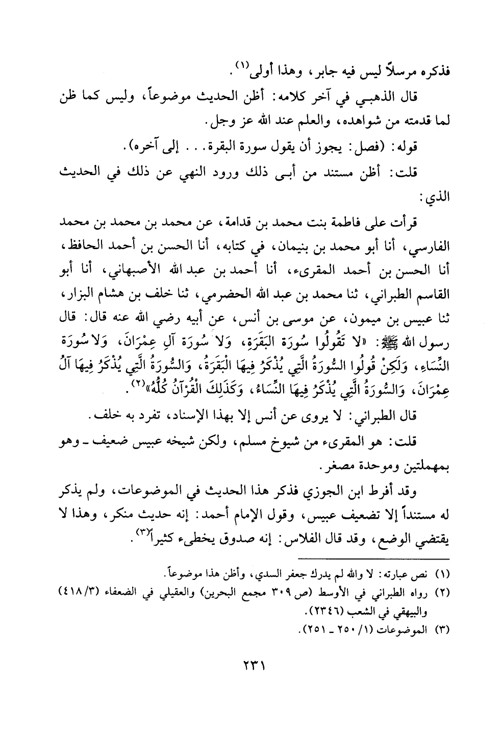 قرأت على فاطمة بنت محمد بن قدامة، عن محمد بن محمد بن محمد الفارسي، أنا أبو محمد بن بنيمان، في كتابه، أنا الحسن بن أحمد الحافظ، أنا الحسن بن أحمد المقرئ، أنا أحمد بن عبد الله الأصبهاني، أنا أبو القاسم الطبراني، ثنا محمد بن عبد الله الحضرمي، ثنا خلف بن هشام البزار، ثنا عيسى بن ميمون، عن موسى بن أنس، عن أبيه رضي الله عنه قال: قال رسول الله صلى الله عليه وسلم: ((لا تقولوا سورة البقرة، ولا سورة آل عمران، ولا سورة النساء، ولكن قولوا السورة التي يذكر فيها البقرة، والسورة التي يذكر فيها آل عمران، والسورة التي يذكر فيها النساء، وكذلك القرآن كله)).