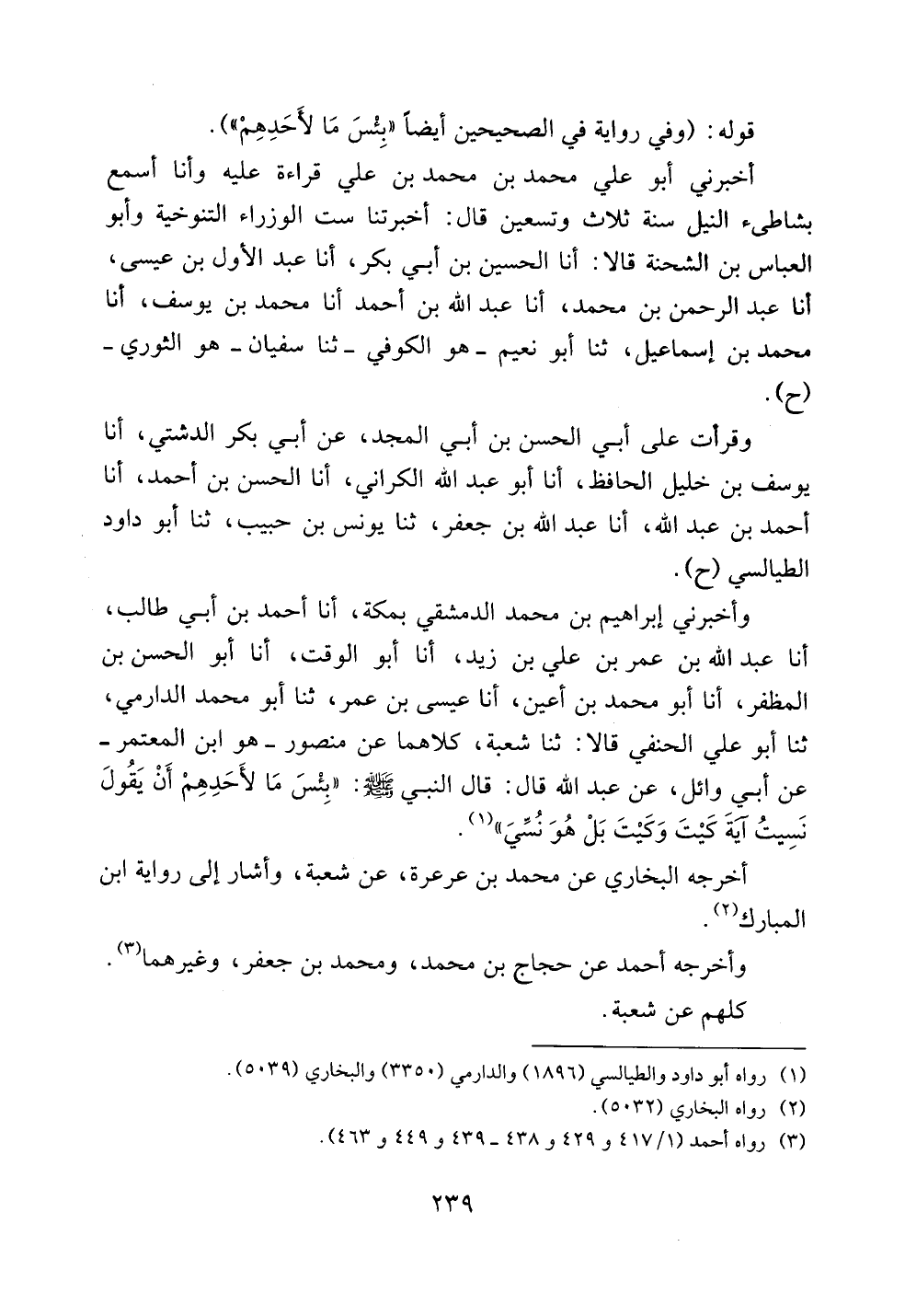 وأخبرني إبراهيم بن محمد الدمشقي بمكة، أنا أحمد بن أبي طالب، أنا عبد الله بن عمر بن علي بن زيد، أنا أبو الوقت، أنا أبو الحسن بن المظفر، أنا أبو محمد بن أعين، أنا عيسى بن عمر، ثنا أبو محمد الدارمي، ثنا أبو علي الحنفي قالا: ثنا شعبة، كلاهما عن منصور -هو ابن المعتمر- عن أبي وائل، عن عبد الله بن قال: قال النبي صلى الله عليه وسلم: ((بئس ما لأحدهم أن يقول نسيت آية كيت وكيت بل هو نسي)).