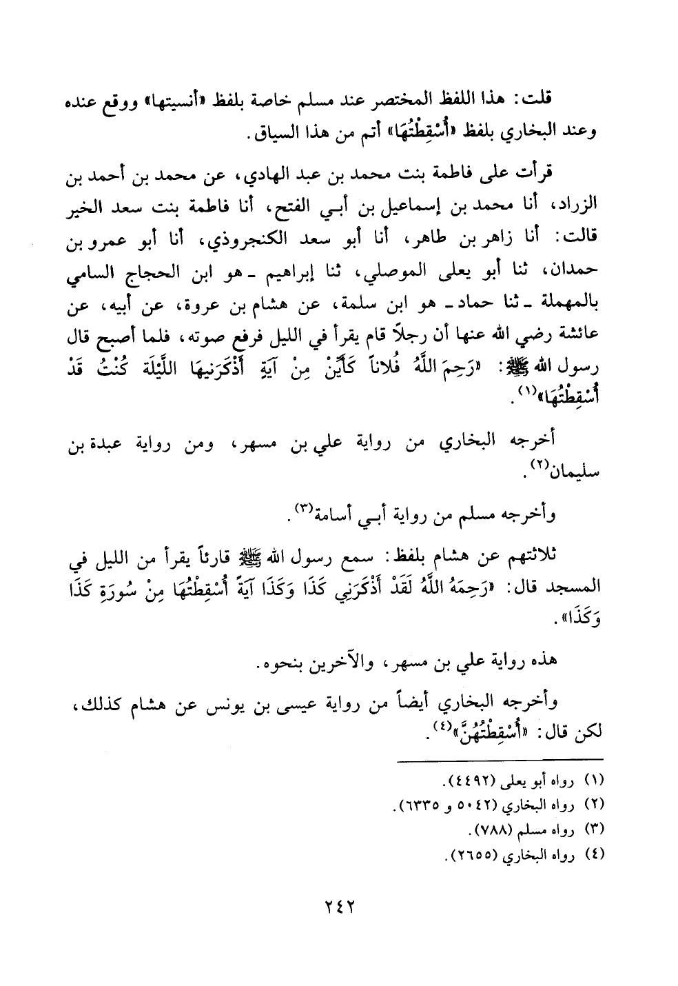 قرأت على فاطمة بنت محمد بن عبد الهادي، عن محمد بن أحمد بن الزراد، أنا محمد بن إسماعيل بن أبي الفتح، أنا فاطمة بنت سعد الخير قالت: أنا زاهر بن طاهر، أنا أبو سعد الكنجروذي، أنا أبو عمرو بن حمدان، ثنا أبو يعلى الموصلي، ثنا إبراهيم -هو ابن الحجاج السامي بالمهملة- ثنا حماد - هو ابن سلمة، عن هشام بن عروة، عن أبيه، عن عائشة رضي الله عنها أن رجلاً قام يقرأ في الليل فرفع صوته، فلما أصبح قال رسول الله صلى الله عليه وسلم: ((رحم الله فلاناً كأين من آيةٍ أذكرنيها الليلة كنت قد أسقطتها)).