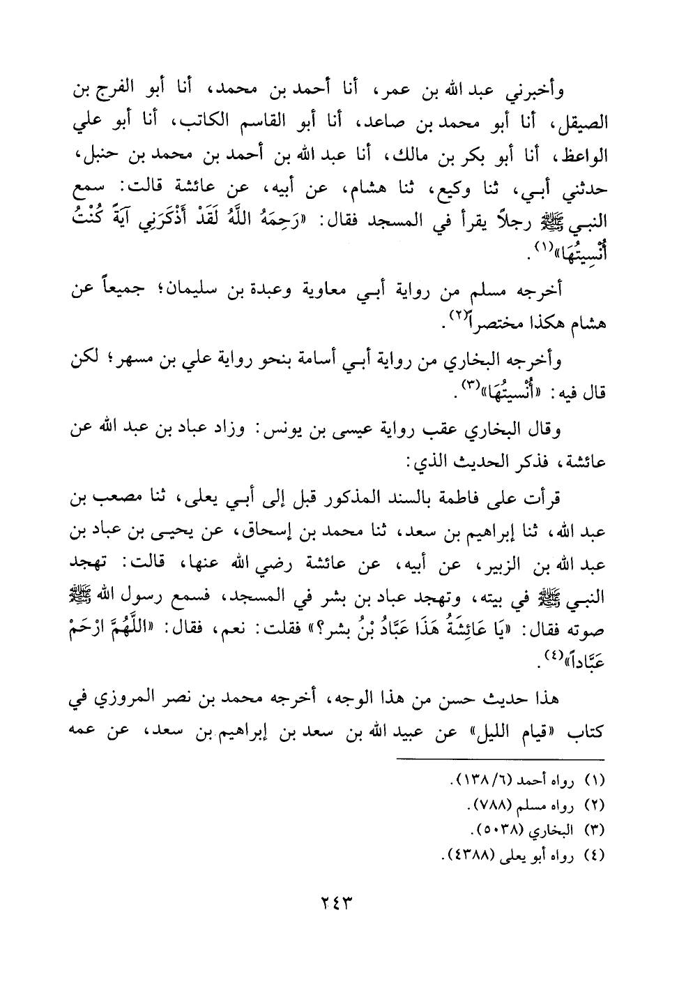 وأخبرني عبد الله بن عمر، أنا أحمد بن محمد، أنا أبو الفرج بن الصيقل، أنا أبو محمد بن صاعد، أنا أبو القاسم الكاتب، أنا أبو علي الواعظ، أنا أبو بكر بن مالك، أنا عبد الله بن أحمد بن محمد بن حنبل، حدثني أبي، ثنا وكيع، ثنا هشام، عن أبيه، عن عائشة قالت: سمع النبي صلى الله عليه وسلم رجلاً يقرأ في المسجد فقال: ((رحمه الله لقد أذكرني آيةً كنت أنسيتها)).