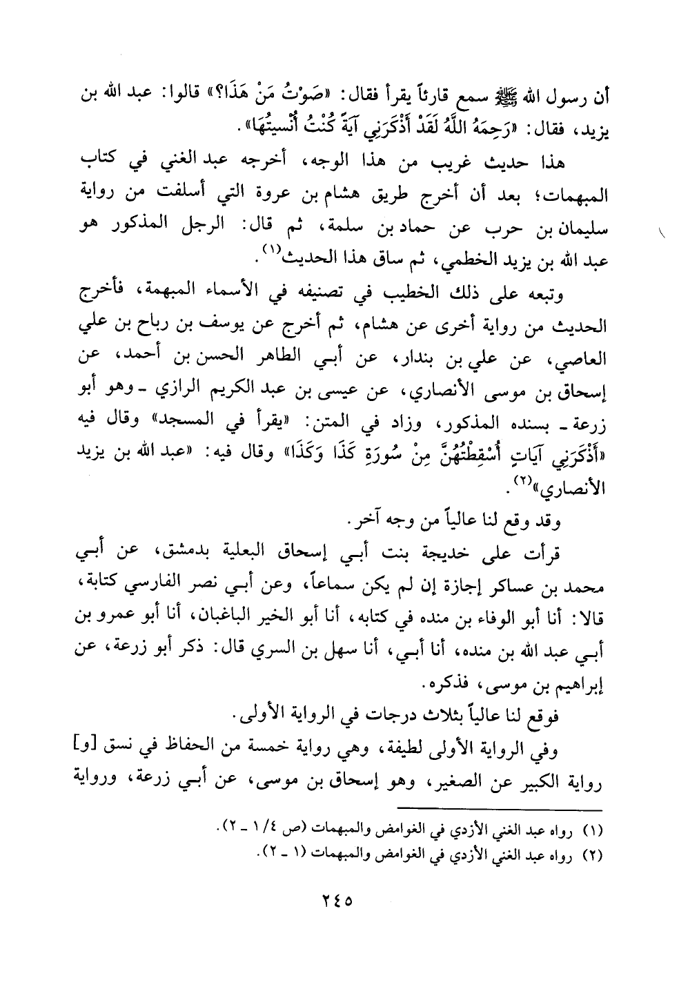 وتبعه على ذلك الخطيب في تصنيفه في الأسماء المبهمة، فأخرج الحديث من رواية أخرى عن هشام، ثم أخرج عن يوسف بن رباح بن علي العاصي، عن علي بن بندار، عن أبي الطاهر الحسن بن أحمد، عن إسحاق بن موسى الأنصاري، عن عيسى بن عبد الكريم الرازي -وهو أبو زرعة- بسنده المذكور، وزاد في المتن: ((يقرأ في المسجد)) وقال فيه ((أذكرني آياتٍ أسقطتهن من سورة كذا وكذا)) وقال فيه: ((عبد الله بن يزيد الأنصاري)).