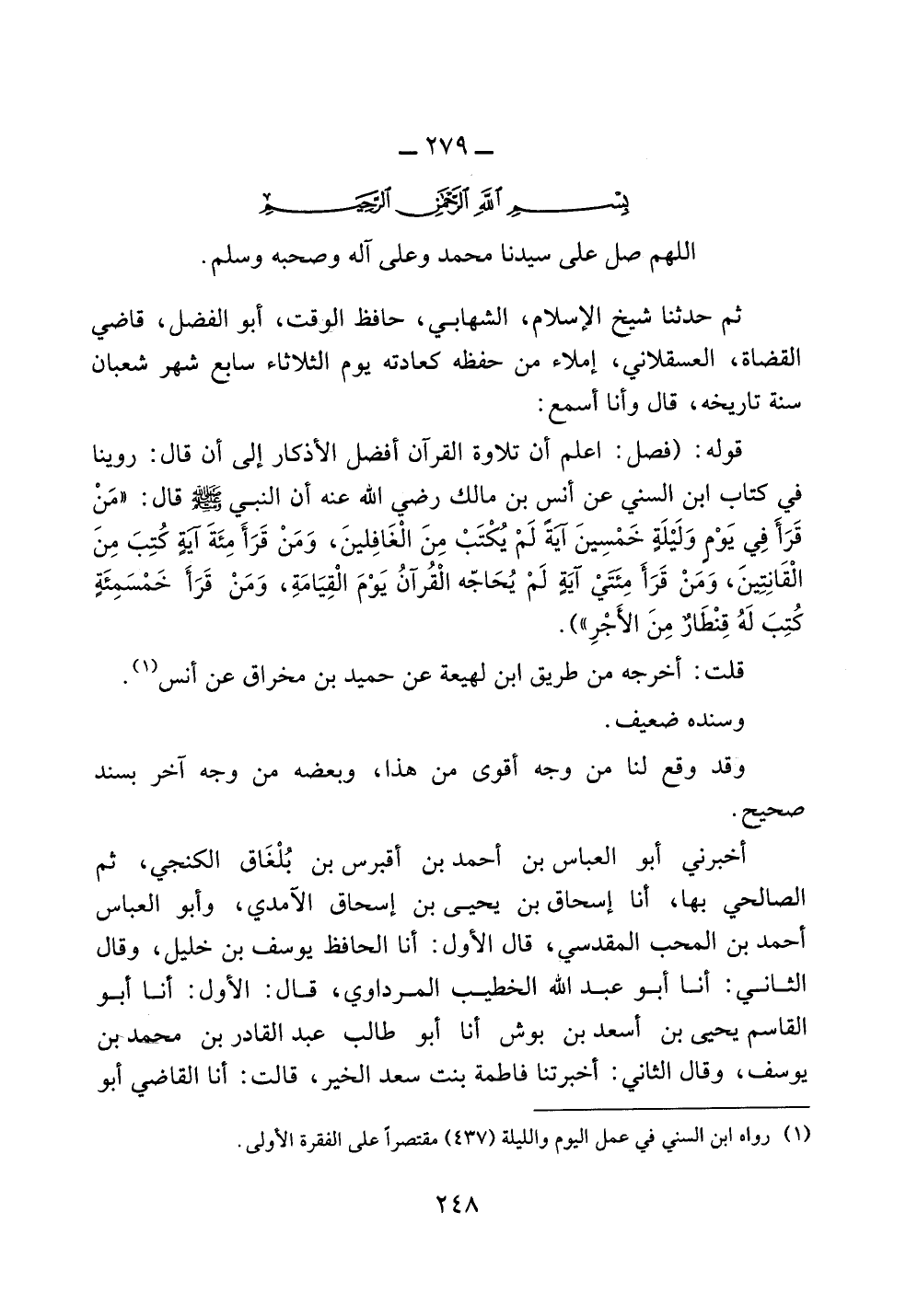 قوله: (فصل: اعلم أن تلاوة القرآن أفضل الأذكار إلى أن قال: روينا في كتاب ابن السني عن أنس بن مالك رضي الله عنه أن النبي صلى الله عليه وسلم قال: ((من قرأ في يومٍ وليلةٍ خمسين آيةً لم يكتب من الغافلين، ومن قرأ مئه آيةٍ كتب من القانتين، ومن قرأ مئتي آيةٍ لم يحاجه القرآن يوم القيامة، ومن قرأ خمسمئةٍ كتب له قنطارٌ من الأجر)) ).