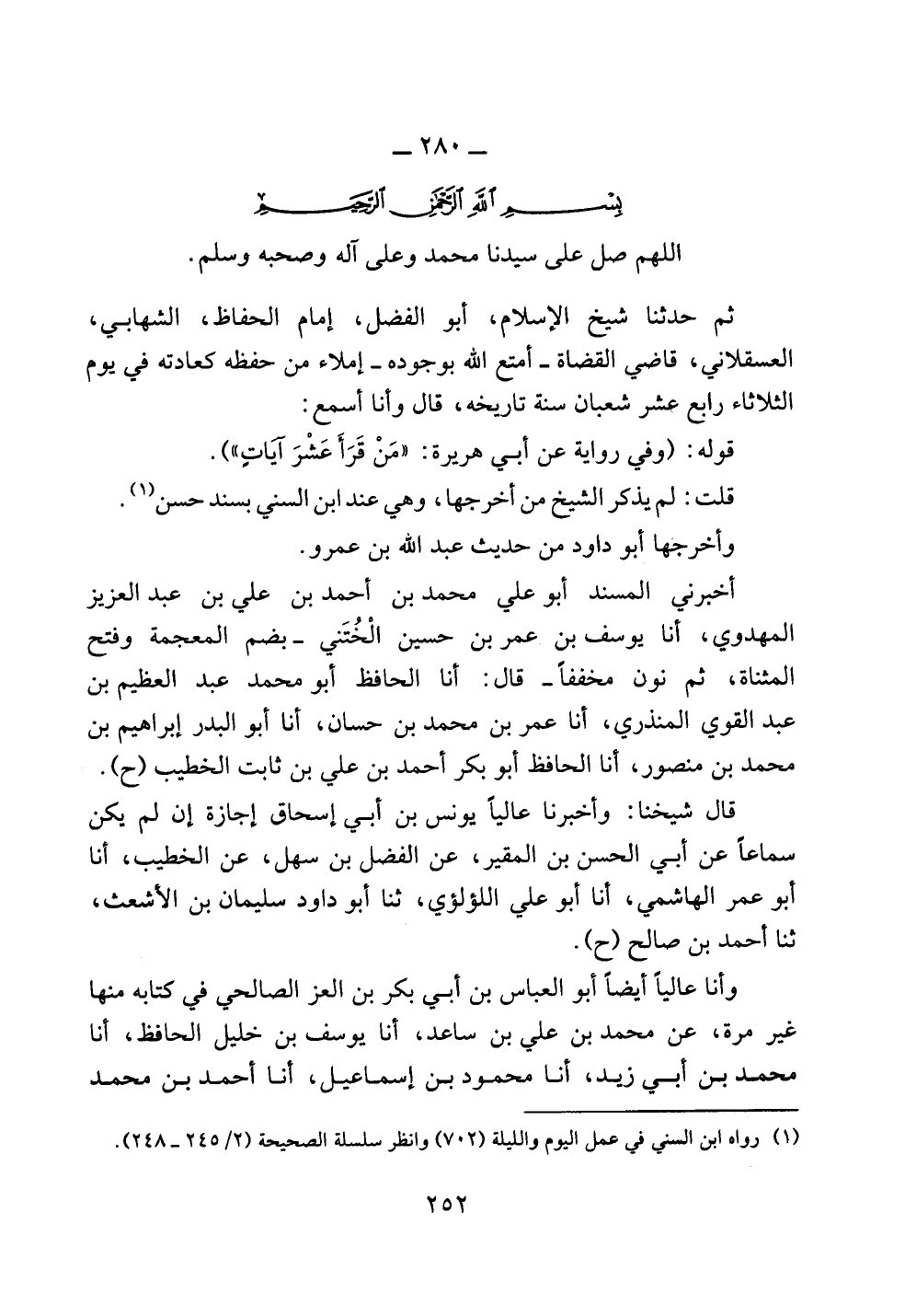 ثم حدثنا شيخ الإسلام، أبو الفضل، إمام الحفاظ، الشهابي، العسقلاني، قاضي القضاة -أمتع الله بوجوده- إملاء من حفظه كعادته في يوم الثلاثاء رابع عشر شعبان سنة تاريخه، قال وأنا أسمع: