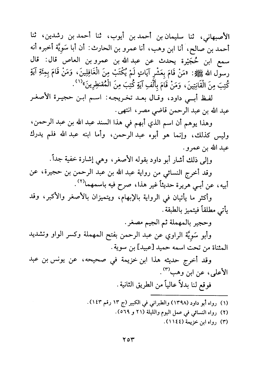 الأصبهاني، ثنا سليمان بن أحمد بن أيوب، ثنا أحمد بن رشدين، ثنا أحمد بن صالح، أنا ابن وهب، أنا عمرو بن الحارث: أن أبا سوية أخبره أنه سمع ابن حجيرة يحدث عن عبد الله بن عمرو بن العاص قال: قال رسول الله صلى الله عليه وسلم: ((من قام بعشر آياتٍ لم يكتب من الغافلين، ومن قام بمئة آيةٍ كتب من القانتين، ومن قام بألف آيةٍ كتب من المقنطرين)).