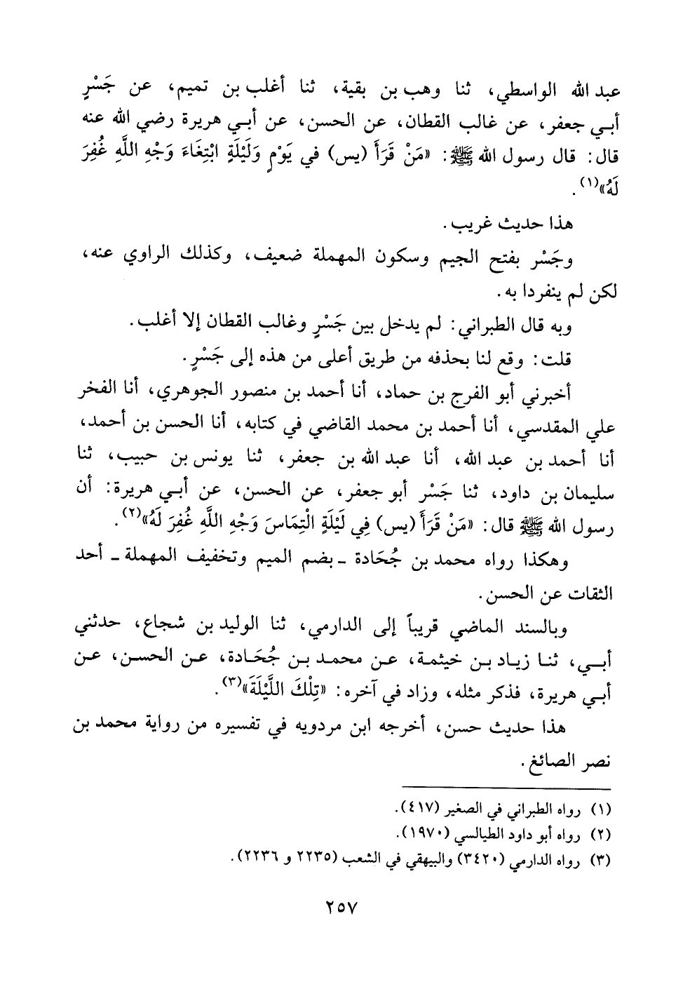 عبد الله الواسطي، ثنا وهب بن بقية، ثنا أغلب بن تميم، عن جسرٍ أبي جعفر، عن غالب القطان، عن الحسن، عن أبي هريرة رضي الله عنه قال: قال رسول الله صلى الله عليه وسلم: ((من قرأ (يس) في يومٍ وليلةٍ ابتغاء وجه الله غفر له)).