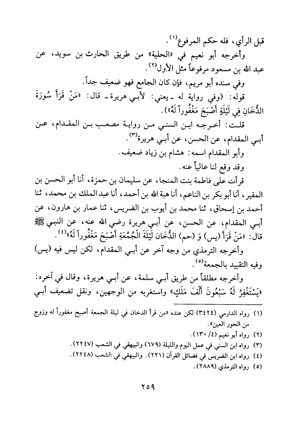 قرأت على فاطمة بنت المنجا، عن سليمان بن حمزة، أنا أبو الحسن بن المقير، أنا أبو بكر بن الناعم، أنا هبة الله بن أحمد، أنا عبد الملك بن محمد، ثنا أحمد بن إسحاق، ثنا محمد بن أيوب بن الضريس، ثنا عمار بن هارون، عن أبي المقدام، عن الحسن، عن أبي هريرة رضي الله عنه، عن النبي صلى الله عليه وسلم قال: ((من قرأ (يس) و (حم) الدخان ليلة الجمعة أصبح مغفوراً له)).