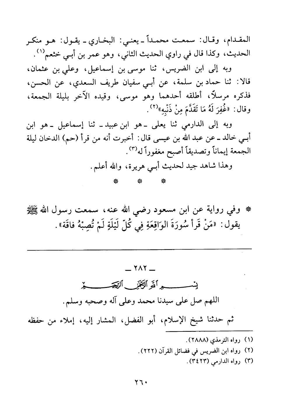وبه إلى ابن الضريس، ثنا موسى بن إسماعيل، وعلي بن عثمان، قالا: ثنا حماد بن سلمة، عن أبي سفيان طريف السعدي، عن الحسن، فذكره مرسلاً، أطلقه أحدهما وهو موسى، وقيده الآخر بليلة الجمعة، وقال: ((غفر له ما تقدم من ذنبه)).