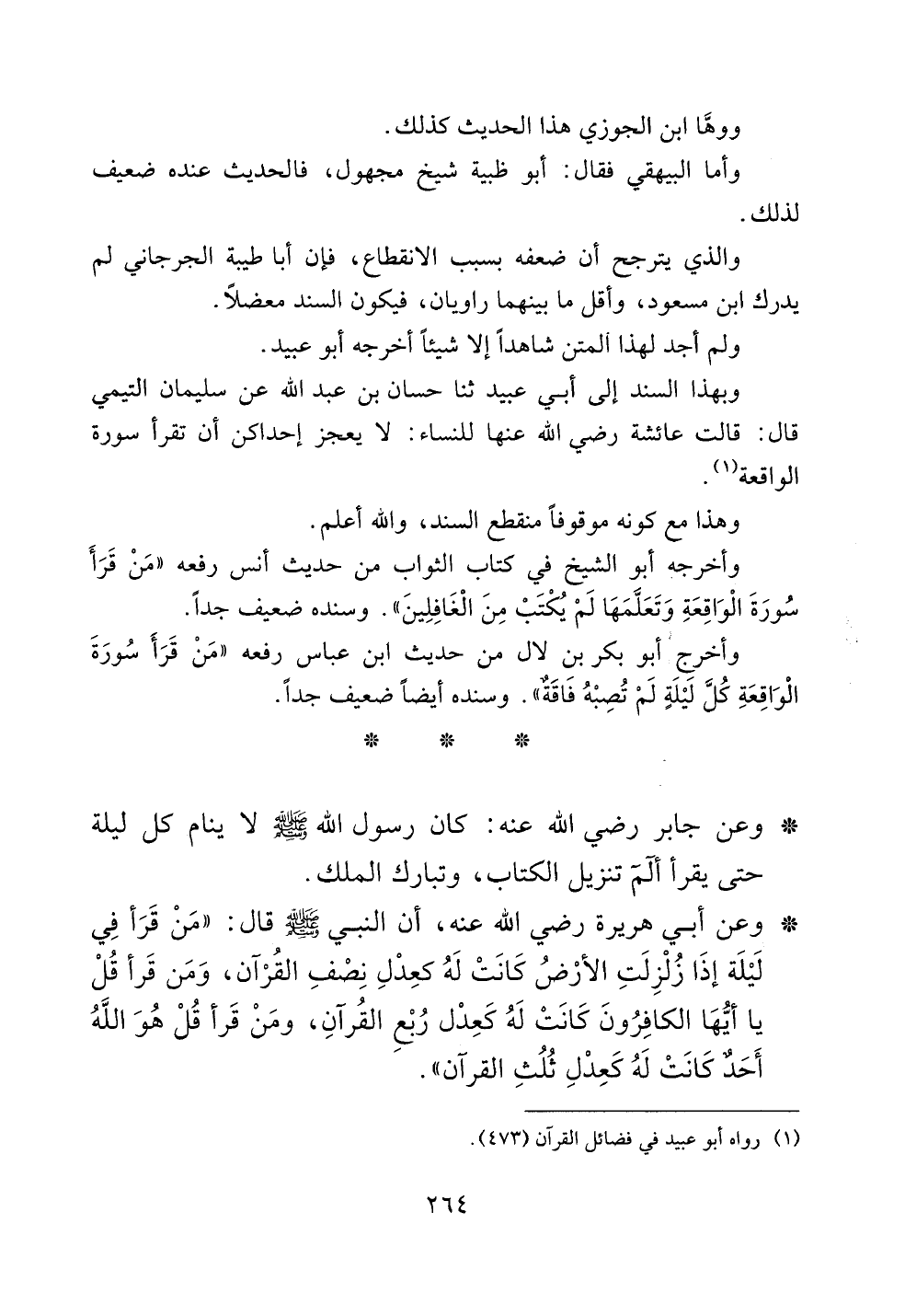 وبهذا السند إلى أبي عبيد ثنا حسان بن عبد الله عن سليمان التيمي قال: قالت عائشة رضي الله عنها للنساء: لا يعجز إحداكن أن تقرأ سورة الواقعة.
