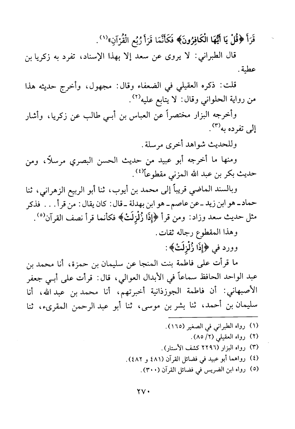 وبالسند الماضي قريباً إلى محمد بن أيوب، ثنا أبو الربيع الزهراني، ثنا حماد -هو ابن زيد- عن عاصم-هو ابن بهدلة- قال: كان يقال: من قرأ .. .. فذكر مثل حديث سعد وزاد: ومن قرأ {إذا زلزلت} فكأنما قرأ نصف القرآن.