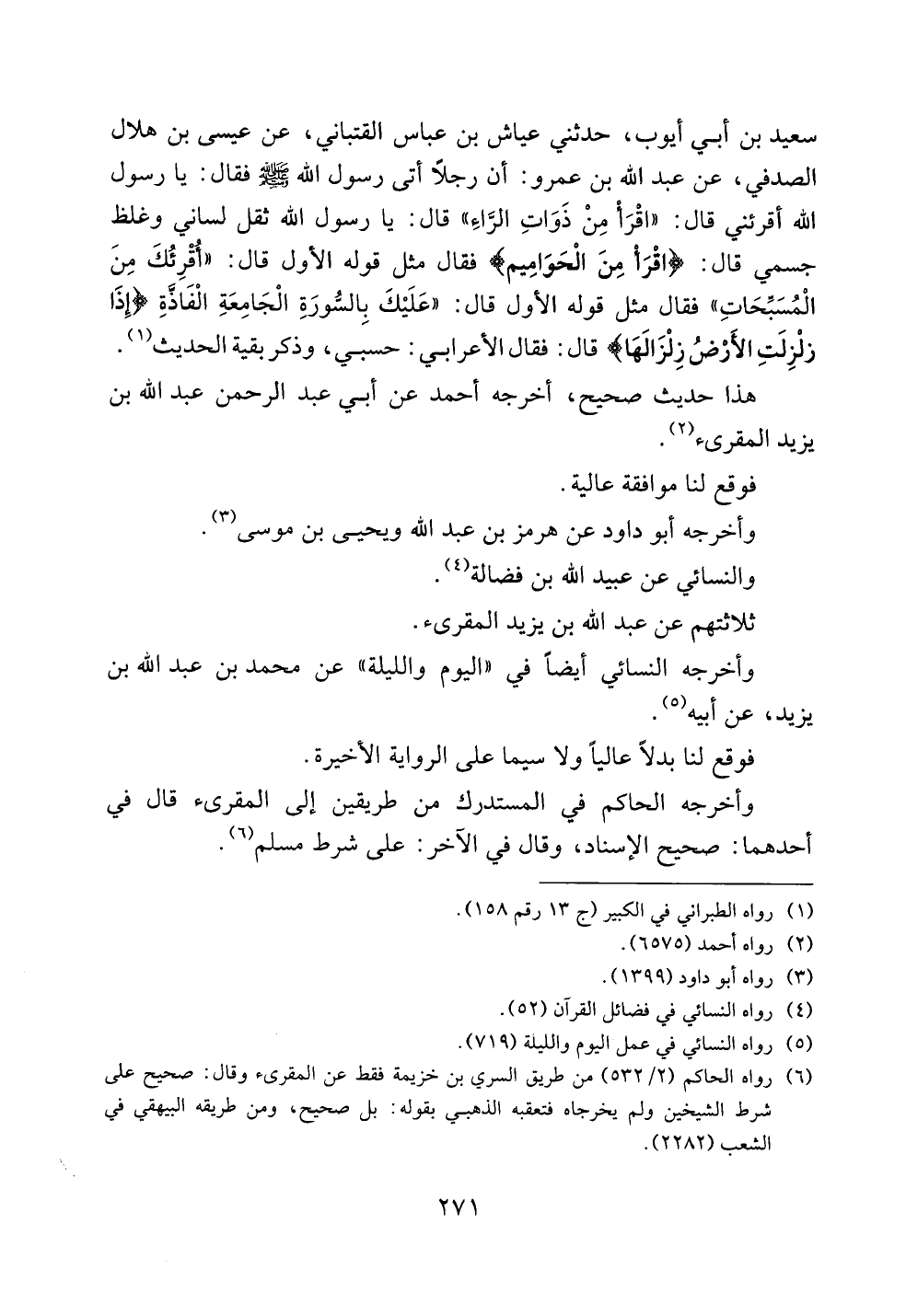سعيد بن أبي أيوب، حدثني عياش بن عباس القتباني، عن عيسى بن هلال الصدفي، عن عبد الله بن عمرو، أن رجلاً أتى رسول الله صلى الله عليه وسلم فقال: يا رسول الله أقرئني قال: ((اقرأ من ذوات الراء)) قال: يا رسول الله ثقل لساني وغلظ جسمي قال: (اقرأ من الحواميم) فقال: مثل قوله الأول قال: ((أقرئك من المسبحات)) فقال مثل قوله الأول قال: ((عليك بالسورة الجامعة الفاذة {إذا زلزلت الأرض زلزالها} قال: فقال الأعرابي: حسبي، وذكر بقية الحديث.