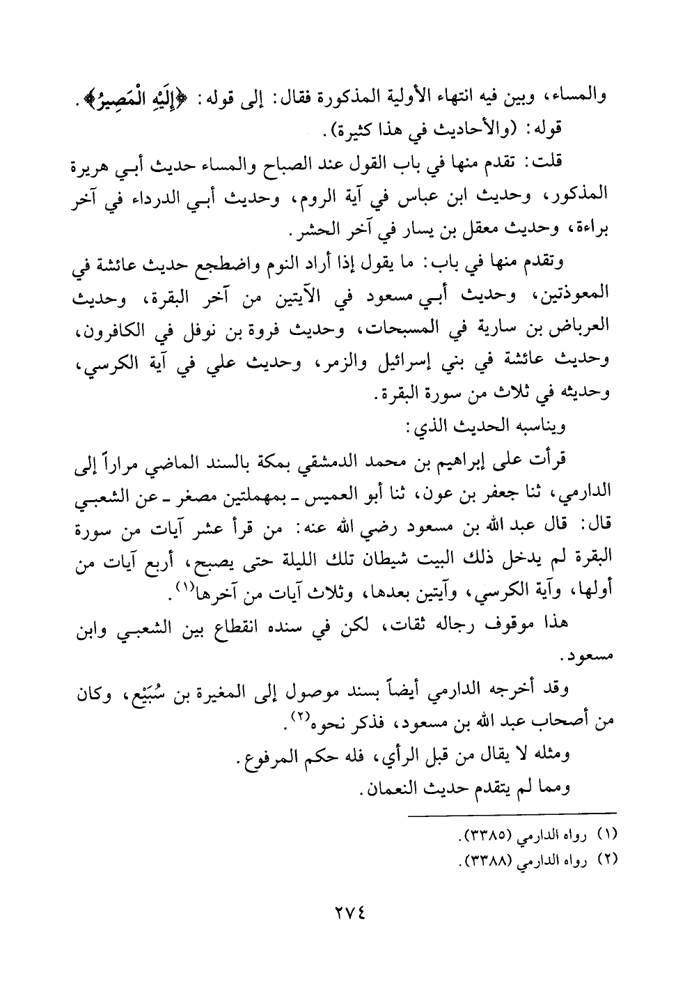 قرأت على إبراهيم بن محمد الدمشقي بمكة بالسند الماضي مراراً إلى الدارمي، ثنا جعفر بن عون، ثنا أبو العميس -بمهملتين مصغر- عن الشعبي قال: قال عبد الله بن مسعود رضي الله عنه: من قرأ عشر آيات من سورة البقرة لم يدخل ذلك البيت شيطان تلك الليلة حتى يصبح، أربع آيات من أولها، وآية الكرسي، وآيتين بعدها، وثلاث آيات من آخرها.