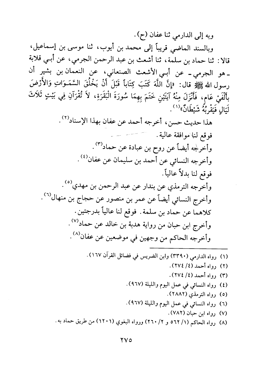 وبالسند الماضي قريباً إلى محمد بن أيوب، ثنا موسى بن إسماعيل، قالا: ثنا حماد بن سلمة، ثنا أشعث بن عبد الرحمن الجرمي، عن أبي قلابة -هو الجرمي- عن أبي الأشعث الصنعاني، عن النعمان بن بشير أن رسول الله صلى الله عليه وسلم قال: ((إن الله كتب كتاباً قبل أن يخلق السموات والأرض بألفي عامٍ، فأنزل منه آيتين ختم بهما سورة البقرة، لا تقرآن في بيتٍ ثلاث ليالٍ فيقربه شيطانٌ)).