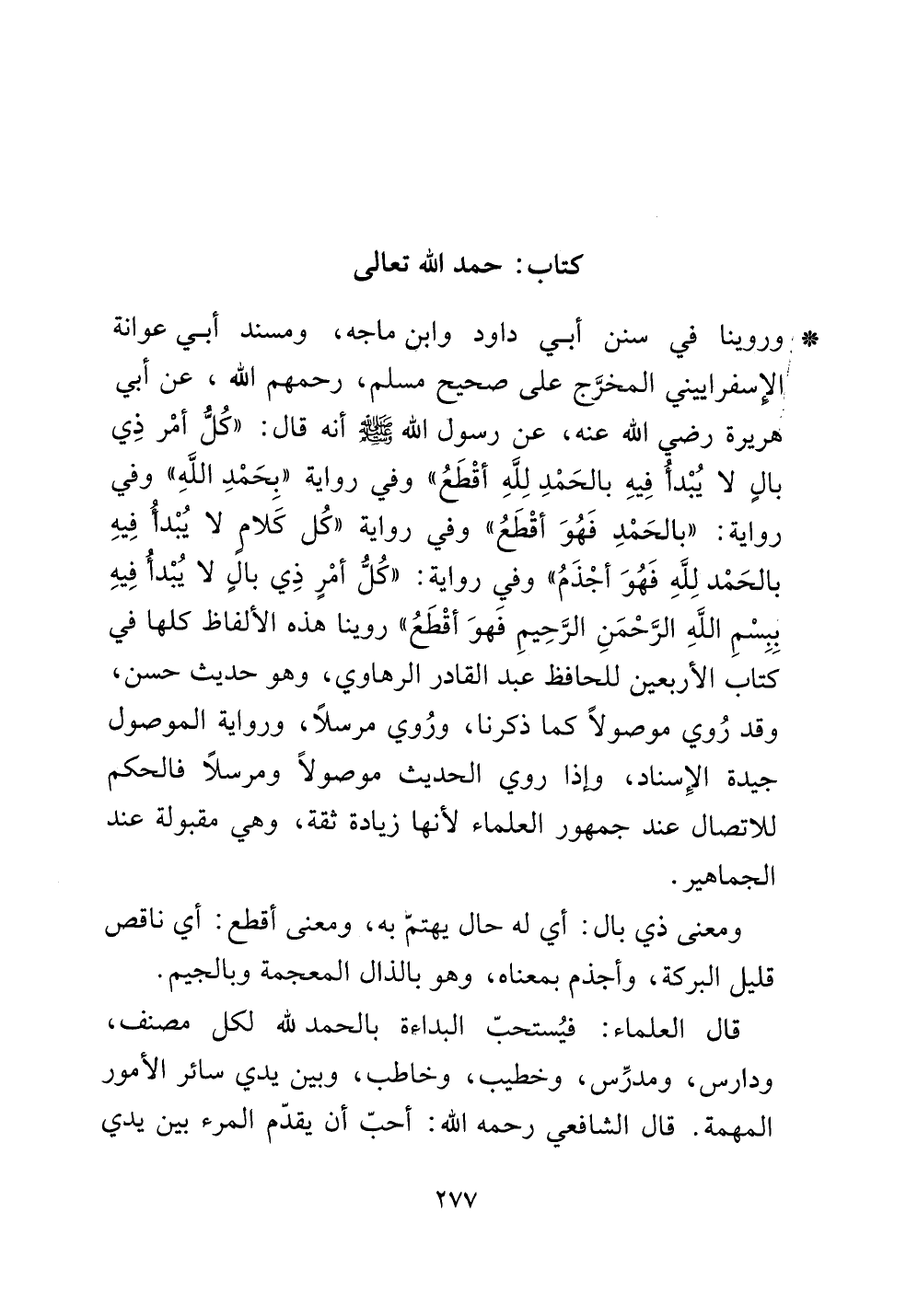 وروينا في سنن أبي داود وابن ماجه، ومسند أبي عوانة الإسفراييني المخرج على صحيح مسلم، رحمهم الله، عن أبي هريرة رضي الله عنه، عن رسول الله صلى الله عليه وسلم أنه قال: ((كل أمر ذي بالٍ لا يبدأ فيه بالحمد لله أقطع)) وفي رواية ((بحمد الله)) وفي رواية: ((بالحمد فهو أقطع)) وفي رواية ((كل كلام لا يبدأ فيه بالحمد لله فهو أجذم)) وفي رواية: ((كل أمرٍ ذي بالٍ لا يبدأ فيه ببسم الله الرحمن الرحيم فهو ((أقطع)) روينا هذه الألفاظ كلها في كتاب الأربعين للحافظ عبد القادر الرهاوي، وهو حديث حسن، وقد روي موصولاً كما ذكرنا، وروي مرسلاً، ورواية الموصول جيدة الإسناد، وإذا روي الحديث موصولاً ومرسلاً فالحكم للاتصال عند جمهور العلماء لأنها زيادة ثقة، وهي مقبولة عند الجماهير.