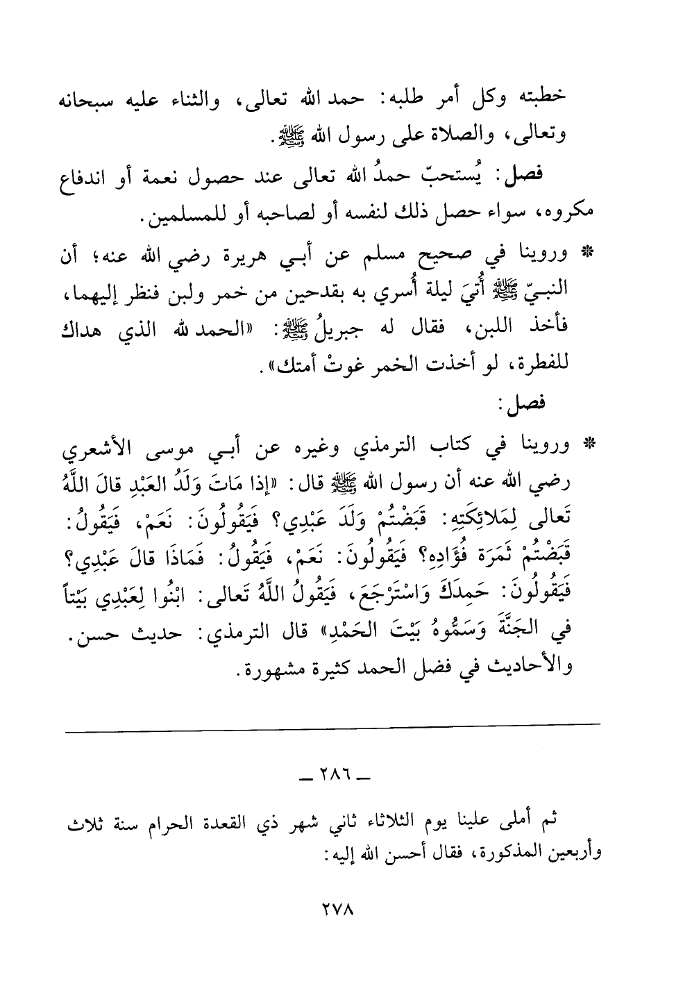 فصل: وروينا في كتاب الترمذي وغيره عن أبي موسى الأشعري رضي الله عنه أن رسول الله صلى الله عليه وسلم قال: ((إذا مات ولد العبد قال الله تعالى لملائكته: قبضتم ولد عبدي؟ فيقولون: نعم، فيقول: قبضتم ثمرة فؤاده؟ فيقولون: نعم، فيقول: فماذا قال عبدي؟ فيقولون: حمدك واسترجع، فيقول الله تعالى: ابنوا لعبدي بيتاً في الجنة وسموه بيت الحمد)) قال الترمذي: حديث حسن. والأحاديث في فضل الحمد كثيرة مشهورة.]]