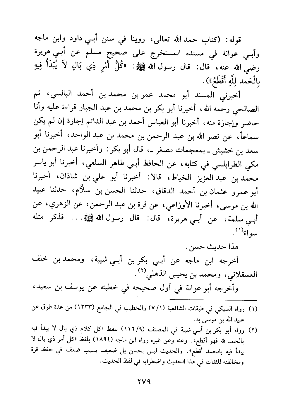 قوله: (كتاب حمد الله تعالى، روينا في سنن أبي داود وابن ماجه وأبي عوانة في مسنده المستخرج على صحيح مسلم عن أبي هريرة رضي الله عنه، قال: قال رسول الله صلى الله عليه وسلم: ((كل أمرٍ ذي بالٍ لا يبدأ فيه بالحمد لله أقطع)) ).