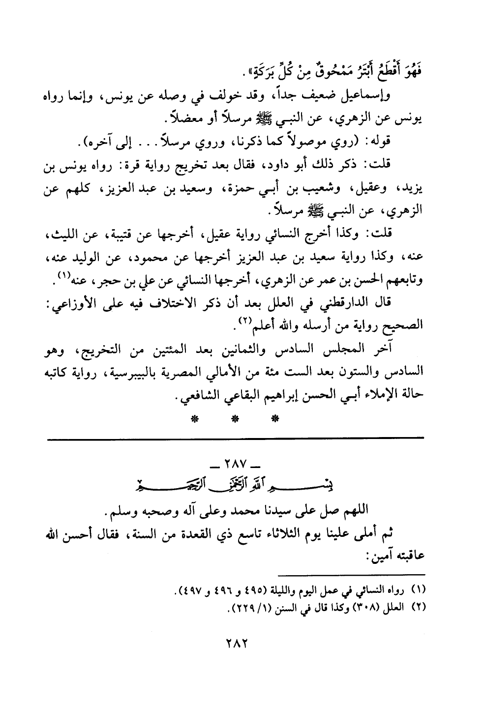 قال الدارقطني في العلل بعد أن ذكر الاختلاف فيه على الأوزاعي: الصحيح رواية من أرسله والله أعلم.
