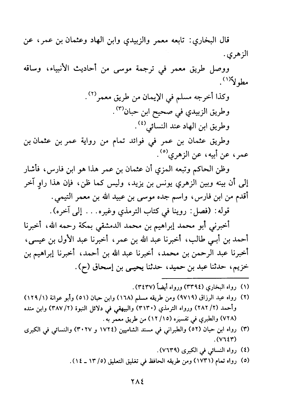 ووصل طريق معمر في ترجمة موسى من أحاديث الأنبياء، وساقه مطولاً.