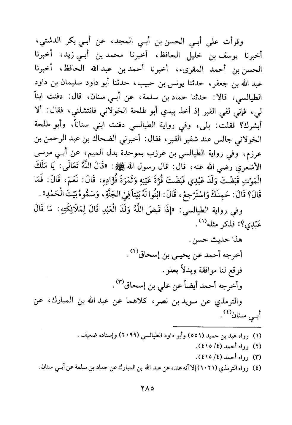 وقرأت على أبي الحسن بن أبي المجد، عن أبي بكر الدشتي، أخبرنا يوسف بن خليل الحافظ، أخبرنا محمد بن أبي زيد، أخبرنا الحسن بن أحمد المقرئ، أخبرنا أحمد بن عبد الله الحافظ، أخبرنا عبد الله بن جعفر، حدثنا يونس بن حبيب، حدثنا أبو داود سليمان بن داود الطيالسي، قالا: حدثنا حماد بن سلمة، عن أبي سنان، قال: دفنت ابناً لي، فإني لفي القبر إذ أخذ بيدي أبو طلحة الخولاني فانتشلني، فقال: ألا أبشرك؟ فقلت: بلى، وفي رواية الطيالسي دفنت ابني سناناً، وأبو طلحة الخولاني جالس عند شفير القبر، فقال: أخبرني الضحاك بن عبد الرحمن بن عرزم، وفي رواية الطيالسي بن عرزب بموحدة بدل الميم، عن أبي موسى الأشعري رضي الله عنه، قال: قال رسول الله صلى الله عليه وسلم: ((قال الله تعالى: يا ملك الموت قبضت ولد عبدي قبضت قرة عينه وثمرة فؤاده، قال: نعم، قال: فما قال؟ قال: حمدك واسترجع، قال: ابنوا له بيتاً في الجنة، وسموه ببيت الحمد)).