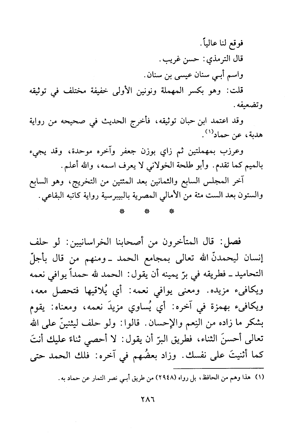 [[فصل: قال المتأخرون من أصحابنا الخراسانيين: لو حلف إنسان ليحمدن الله تعالى بمجامع الحمد-ومنهم من قال بأجل التحاميد- فطريقه في بر يمينه أن يقول: الحمد لله حمداً يوافي نعمه ويكافئ مزيده. ومعنى يوافي نعمه: أي يلاقيها فتحصل معه، ويكافئ بهمزة في آخره: أي يساوي مزيد نعمه، ومعناه: يقوم بشكر ما زاده من النعم والإحسان. قالوا: ولو حلف ليثنين على الله تعالى أحسن الثناء، فطريق البر أن يقول: لا أحصي ثناءً عليك أنت كما أثنيت على نفسك. وزاد بعضهم في آخره: فلك الحمد حتى