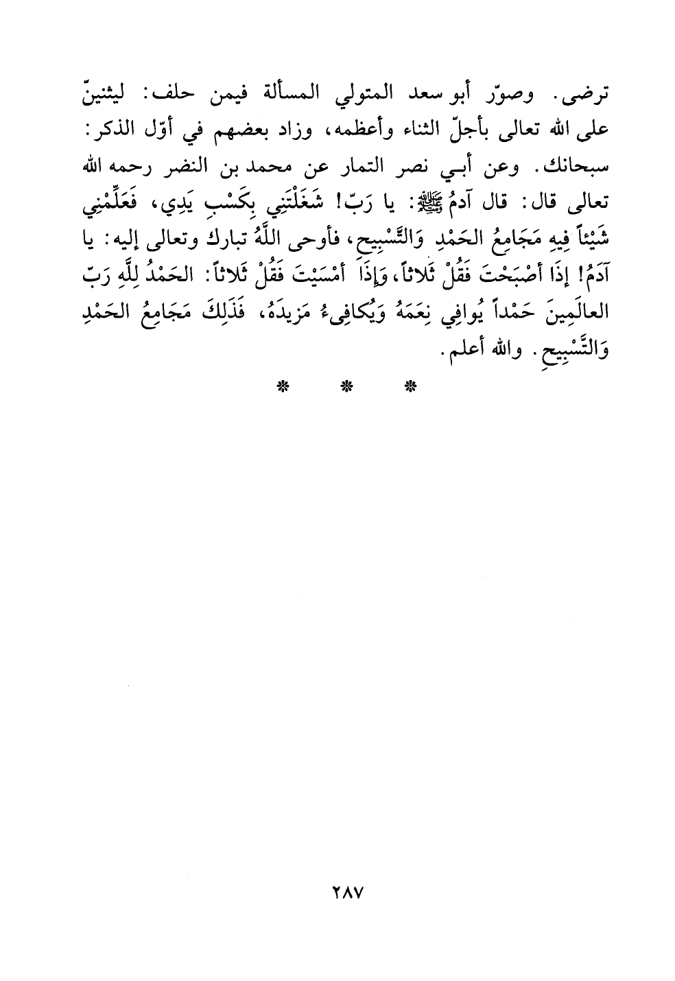 ترضى. وصور أبو سعد المتولي المسألة فيمن حلف: ليثنين على الله تعالى بأجل الثناء وأعظمه، وزاد بعضهم في أول الذكر: سبحانك. وعن أبي نصر التمار عن محمد بن النضر رحمه الله تعالى قال: قال آدم صلى الله عليه وسلم: يا رب! شغلتني بكسب يدي، فعلمني شيئاً فيه مجامع الحمد والتسبيح، فأوحى الله تبارك وتعالى إليه: يا آدم! إذا أصبحت فقل ثلاثاً، وإذا أمسيت فقل ثلاثاً: الحمد لله رب العالمين حمداً يوافي نعمه ويكافئ مزيده، فذلك مجامع الحمد والتسبيح. والله أعلم.