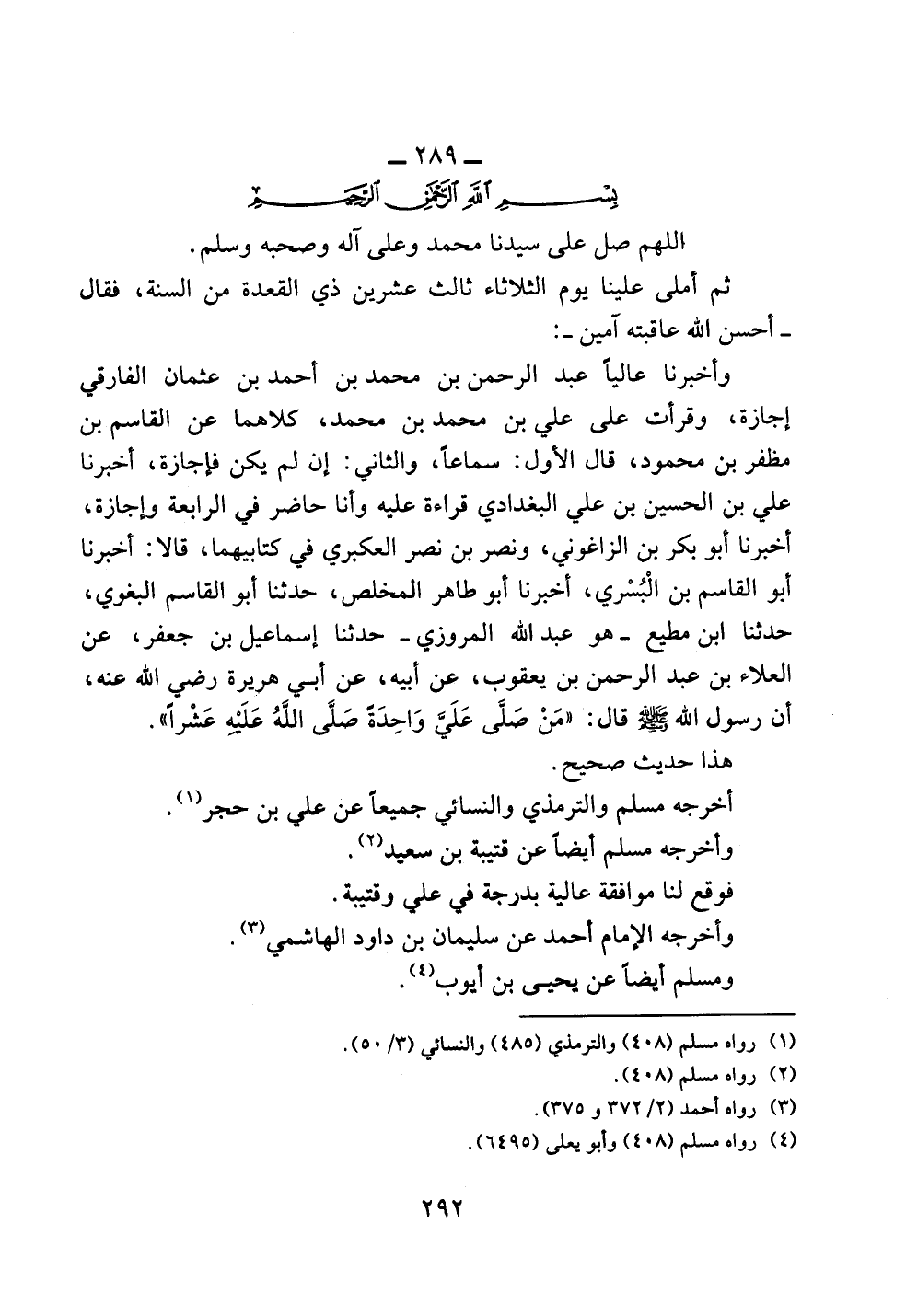 وأخبرنا عالياً عبد الرحمن بن محمد بن أحمد بن عثمان الفارقي إجازة، وقرأت على علي بن محمد بن محمد، كلاهما عن القاسم بن مظفر بن محمود، قال الأول: سماعاً، والثاني: إن لم يكن فإجازة، أخبرنا علي بن الحسين بن علي البغدادي قراءة عليه وأنا حاضر في الرابعة وإجازة، أخبرنا أبو بكر بن الزاغوني، ونصر بن نصر العكبري في كتابيهما، قالا: أخبرنا أبو القاسم بن البسري، أخبرنا أبو طاهر المخلص، حدثنا أبو القاسم البغوي، حدثنا ابن مطيع -هو عبد الله المروزي- حدثنا إسماعيل بن جعفر، عن العلاء بن عبد الرحمن بن يعقوب، عن أبيه، عن أبي هريرة رضي الله عنه، أن رسول الله صلى الله عليه وسلم قال: ((من صلى علي واحدةً صلى الله عليه عشراً)).