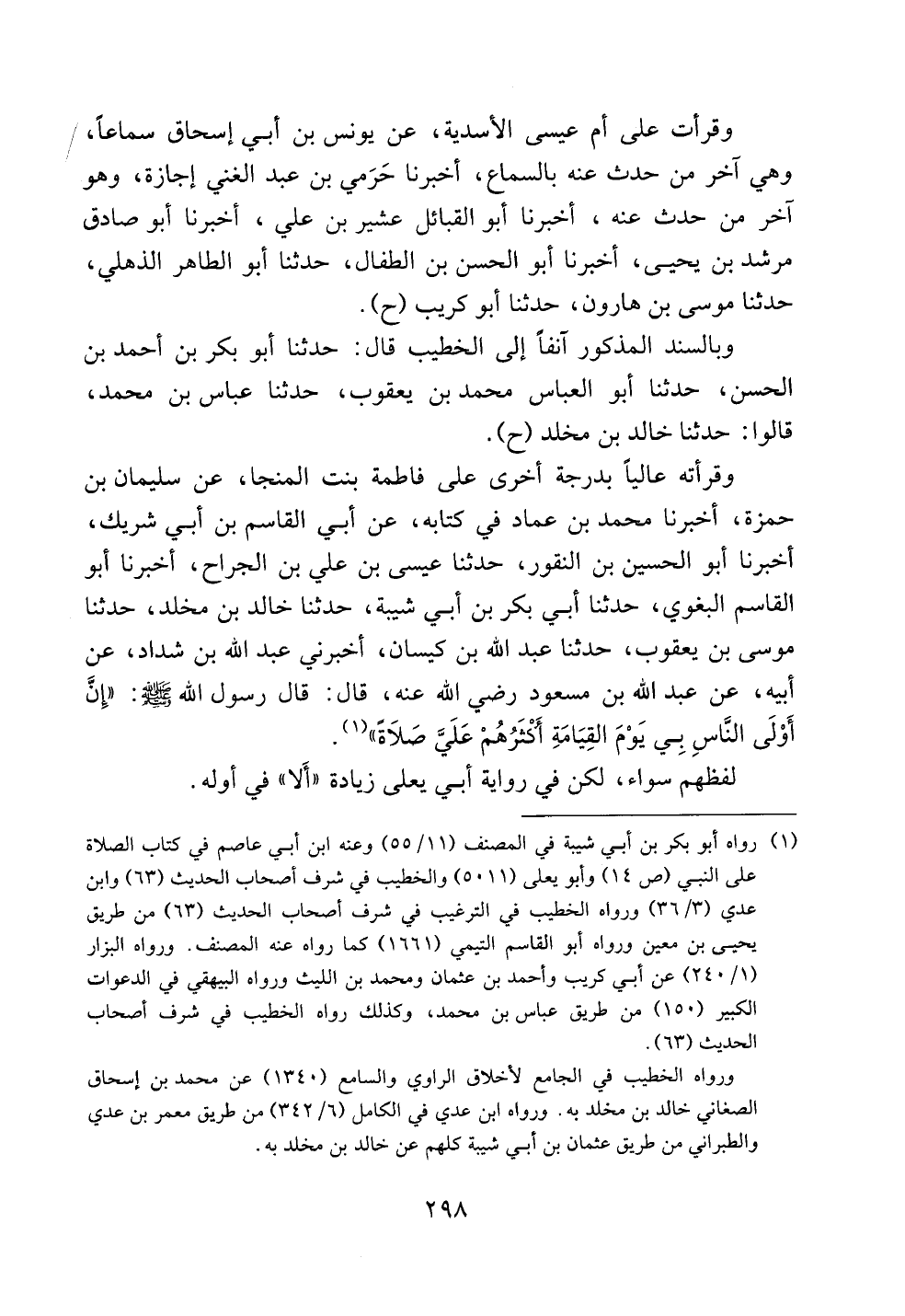 وقرأته عالياً بدرجة أخرى على فاطمة بنت المنجا، عن سليمان بن حمزة، أخبرنا محمد بن عماد في كتابه، عن أبي القاسم بن أبي شريك، أخبرنا أبو الحسين بن النقور، حدثنا عيسى بن علي بن الجراح، أخبرنا أبو القاسم البغوي، حدثنا أبي بكر بن أبي شيبة، حدثنا خالد بن مخلد، حدثنا موسى بن يعقوب، حدثنا عبد الله بن كيسان، أخبرني عبد الله بن شداد، عن أبيه، عن عبد الله بن مسعود رضي الله عنه، قال: قال رسول الله صلى الله عليه وسلم: ((إن أولى الناس بي يوم القيامة أكثرهم علي صلاةً)).