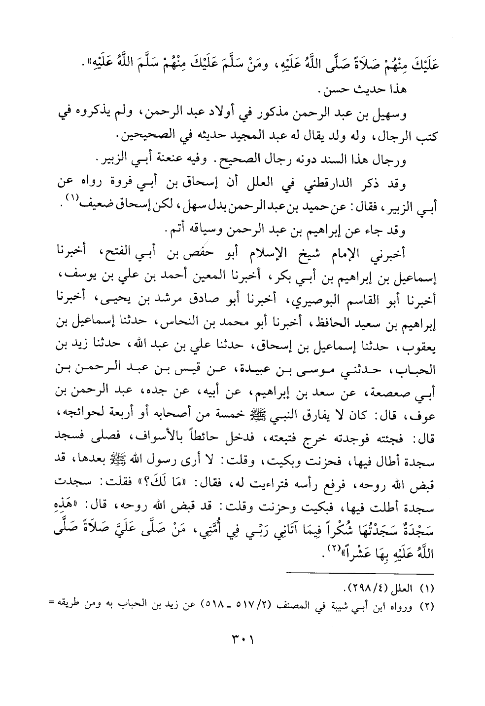 أخبرني الإمام شيخ الإسلام أبو حفص بن أبي الفتح، أخبرنا إسماعيل بن إبراهيم بن أبي بكر، أخبرنا المعين أحمد بن علي بن يوسف، أخبرنا أبو القاسم البوصيري، أخبرنا أبو صادق مرشد بن يحيى، أخبرنا إبراهيم بن سعيد الحافظ، أخبرنا أبو محمد بن النحاس، حدثنا إسماعيل بن يعقوب، حدثنا إسماعيل بن إسحاق، حدثنا علي بن عبد الله، حدثنا زيد بن الحباب، حدثني موسى بن عبيدة، عن قيس بن عبد الرحمن بن أبي صعصعة، عن سعد بن إبراهيم، عن أبيه، عن جده، عبد الرحمن بن عوف، قال: كان لا يفارق النبي صلى الله عليه وسلم خمسة من أصحابه أو أربعة لحوائجه، قال: فجئته فوجدته خرج فتبعته، فدخل حائطاً بالأسواف، فصلى فسجد سجدة أطال فيها، فحزنت وبكيت، وقلت: لا أرى رسول الله صلى الله عليه وسلم بعدها، قد قبض الله روحه، فرفع رأسه فتراءيت له، فقال: ((ما لك؟)) فقلت: سجدت سجدة أطلت فيها، فبكيت وحزنت وقلت: قد قبض الله روحه، قال: ((هذه سجدةً سجدتها شكراً فيما آتاني ربي في أمتي، من صلى علي صلاةً صلى الله عليه بها عشراً)).