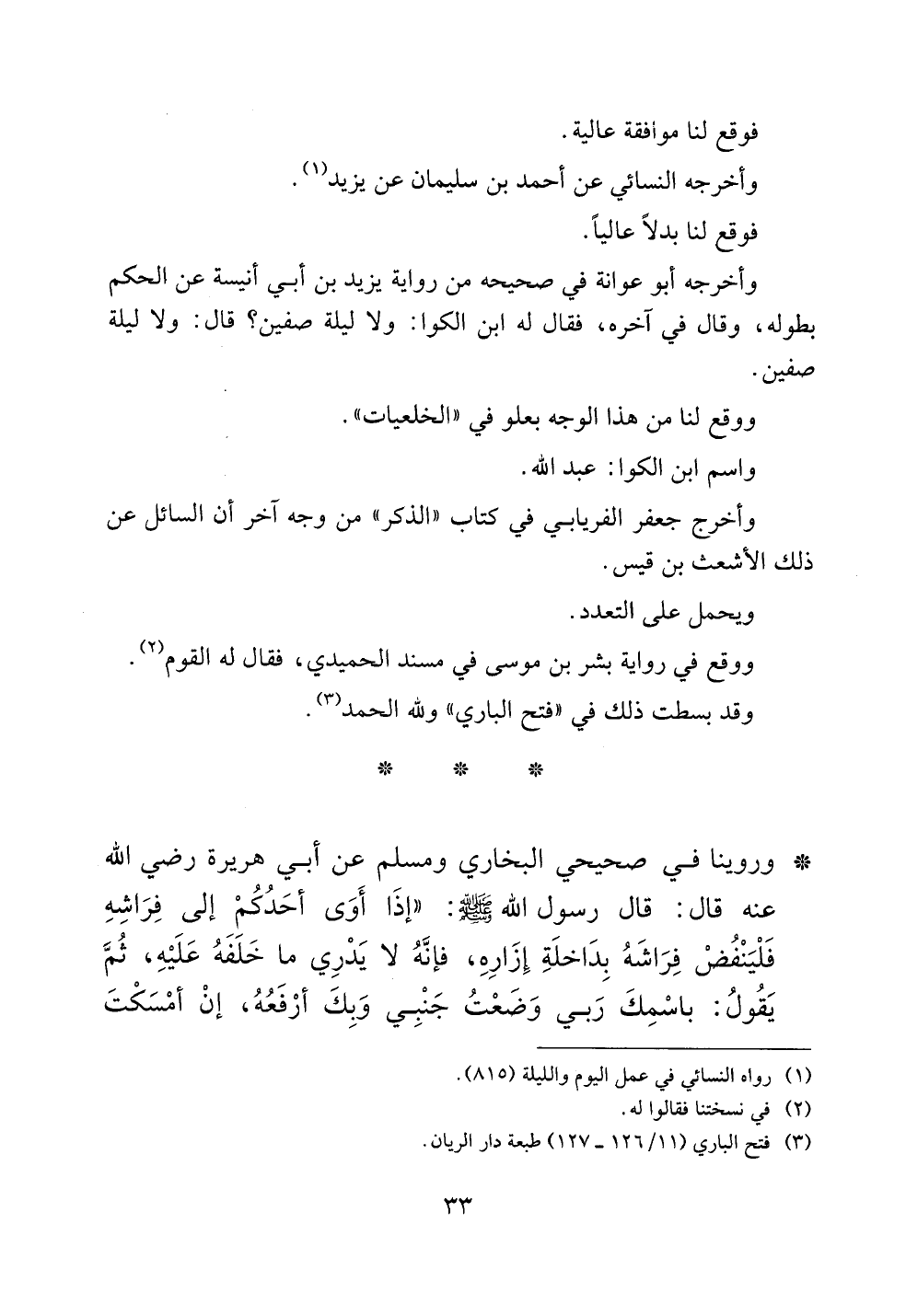 [[وروينا في صحيحي البخاري ومسلم عن أبي هريرة رضي الله عنه قال: قال رسول الله صلى الله عليه وسلم: ((إذا أوى أحدكم إلى فراشه فلينفض فراشه بداخلة إزاره، فإنه لا يدري ما خلفه عليه، ثم يقول: باسمك ربي وضعت جنبي وبك أرفعه، إن أمسكت