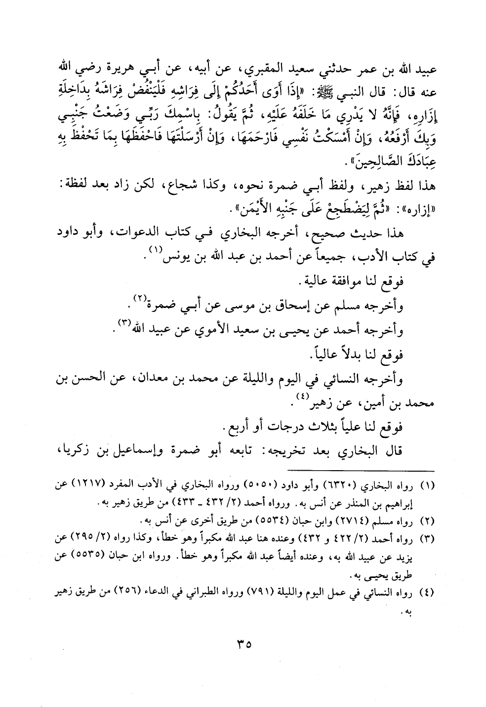 عبيد الله بن عمر حدثني سعيد المقبري، عن أبيه، عن أبي هريرة رضي الله عنه قال: قال النبي صلى الله عليه وسلم: ((إذا أوى أحدكم إلى فراشه فلينفض فراشه بداخلة إزاره، فإنه لا يدري ما خلفه عليه، ثم يقول: باسمك ربي وضعت جنبي وبك أرفعه، وإن أمسكت نفسي فارحمها، وإن أرسلتها فاحفظها بما تحفظ به عبادك الصالحين)).