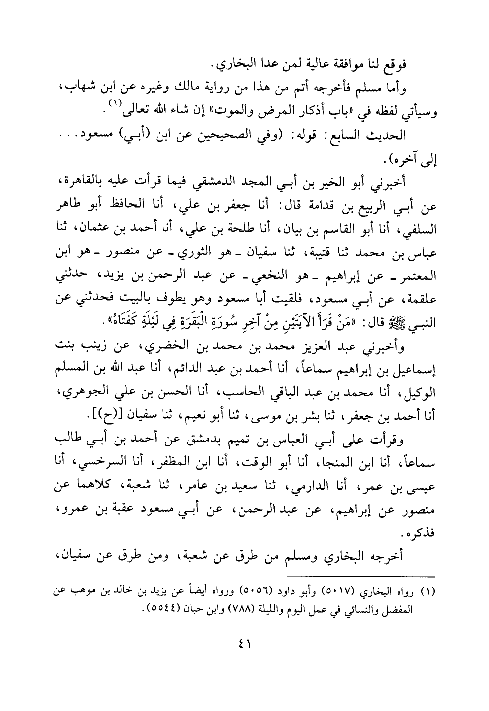 أخبرني أبو الخير بن أبي المجد الدمشقي فيما قرأت عليه بالقاهرة، عن أبي الربيع بن قدامة قال: أنا جعفر بن علي، أنا الحافظ أبو طاهر السلفي، أنا أبو القاسم بن بيان، أنا طلحة بن علي، أنا أحمد بن عثمان، ثنا عباس بن محمد ثنا قتيبة، ثنا سفيان -هو الثوري- عن منصور -هو ابن المعتمر- عن إبراهيم -هو النخعي- عن عبد الرحمن بن يزيد، حدثني علقمة، عن أبي مسعود، فلقيت أبا مسعود وهو يطوف بالبيت فحدثني عن النبي صلى الله عليه وسلم قال: ((من قرأ الآيتين من آخر سورة البقرة في ليلةٍ كفتاه)).