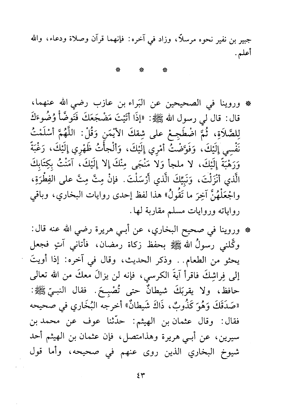 وروينا في صحيح البخاري، عن أبي هريرة رضي الله عنه قال: وكلني رسول الله صلى الله عليه وسلم بحفظ زكاة رمضان، فأتاني آتٍ فجعل يحثو من الطعام.. وذكر الحديث، وقال في آخره: إذا أويت إلى فراشك فاقرأ آية الكرسي، فإنه لن يزال معك من الله تعالى حافظ، ولا يقربك شيطانٌ حتى تصبح. فقال النبي صلى الله عليه وسلم: ((صدقك وهو كذوبٌ، ذاك شيطانٌ)) أخرجه البخاري في صحيحه فقال: وقال عثمان بن الهيثم: حدثنا عوف عن محمد بن سيرين، عن أبي هريرة وهذا متصل، فإن عثمان بن الهيثم أحد شيوخ البخاري الذين روى عنهم في صحيحه، وأما قول
