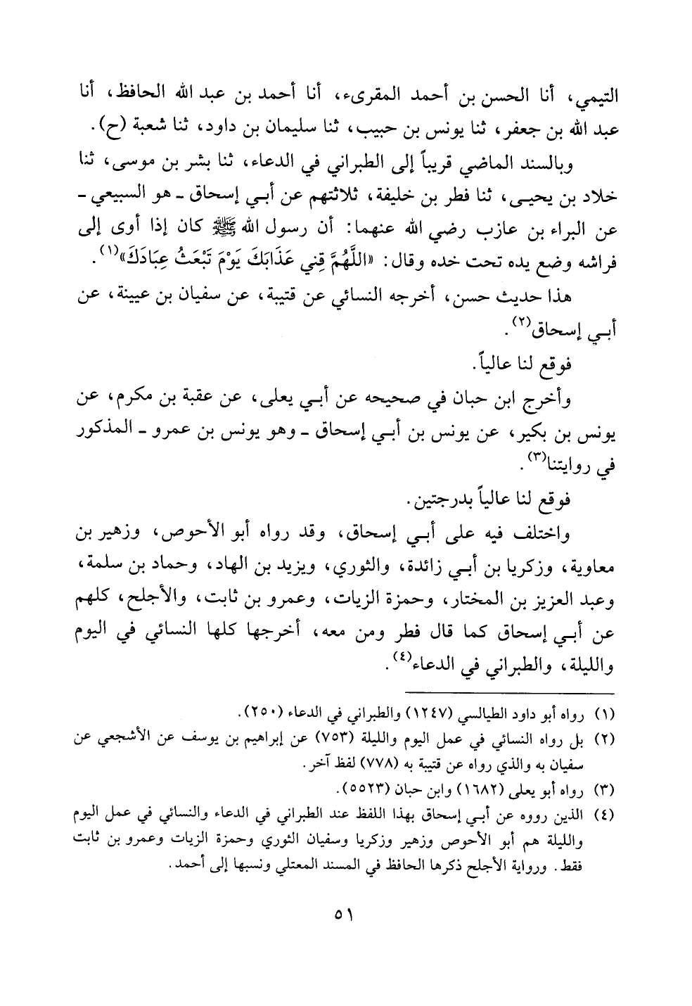 وبالسند الماضي قريباً إلى الطبراني في الدعاء، ثنا بشر بن موسى، ثنا خلاد بن يحيى، ثنا فطر بن خليفة، ثلاثتهم عن أبي إسحاق -هو السبيعي- عن البراء بن عازب رضي الله عنهما: أن رسول الله صلى الله عليه وسلم كان إذا أوى إلى فراشه وضع يده تحت خده وقال: ((اللهم قني عذابك يوم تبعث عبادك)).