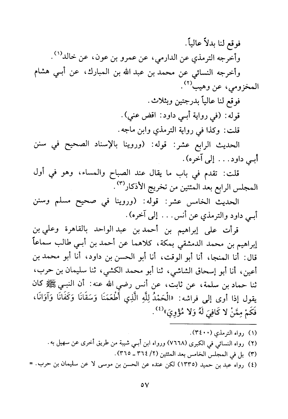 قرأت على إبراهيم بن أحمد بن عبد الواحد بالقاهرة وعلي بن إبراهيم بن محمد الدمشقي بمكة، كلاهما عن أحمد بن أبي طالب سماعاً قال: أنا المنجا، أنا أبو الوقت، أنا أبو الحسن بن داود، أنا أبو محمد بن أعين، أنا أبو إسحاق الشاشي، ثنا أبو محمد الكشي، ثنا سليمان بن حرب، ثنا حماد بن سلمة، عن ثابت، عن أنس رضي الله عنه: أن النبي صلى الله عليه وسلم كان يقول إذا أوى إلى فراشه: ((الحمد لله الذي أطعمنا وسقانا وكفانا وآوانا، فكم ممن لا كافي له ولا مؤوي)).