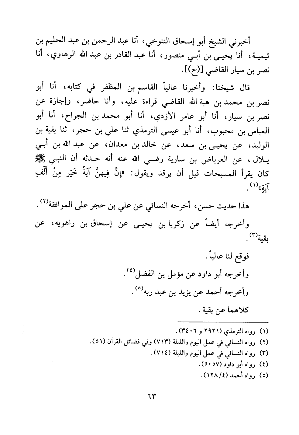 قال شيخنا: وأخبرنا عالياً القاسم بن المظفر في كتابه، أنا أبو نصر بن محمد بن هبة الله القاضي قراءة عليه، وأنا حاضر، وإجازة عن نصر بن سيار، أنا أبو عامر الأزدي، أنا أبو محمد بن الجراح، أنا أبو العباس بن محبوب، أنا أبو عيسى الترمذي ثنا علي بن حجر، ثنا بقية بن الوليد، عن يحيى بن سعد، عن خالد بن معدان، عن عبد الله بن أبي بلال، عن العرباض بن سارية رضي الله عنه أنه حدثه أن النبي صلى الله عليه وسلم كان يقرأ المسبحات قبل أن يرقد ويقول: ((إن فيهن آيةً خير من ألف آيةٍ)).