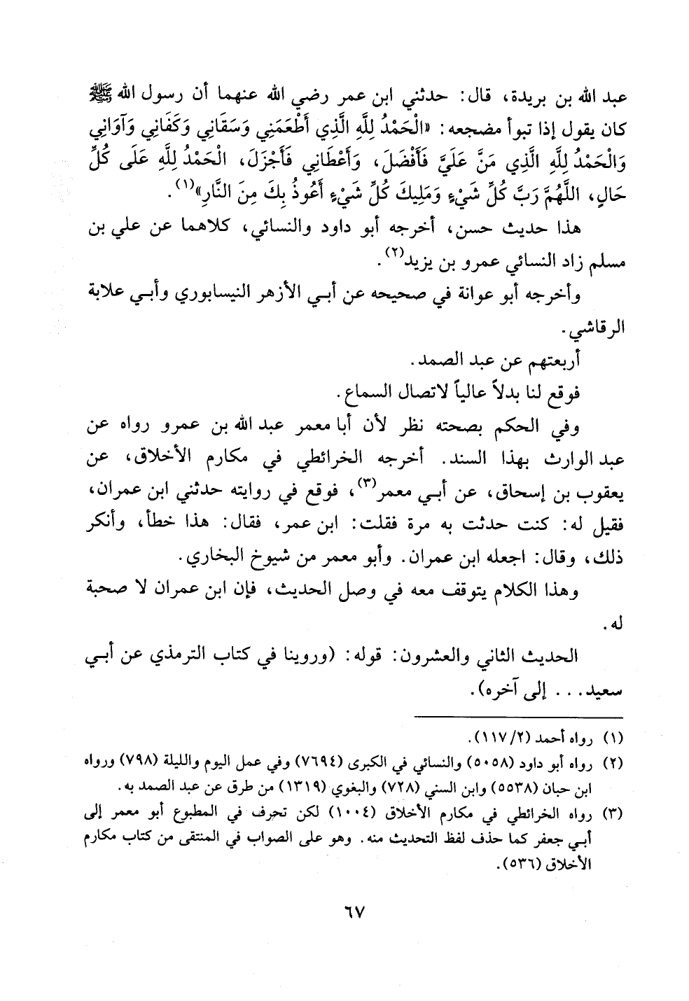 وفي الحكم بصحته نظر لأن أبا معمر عبد الله بن عمرو رواه عن عبد الوارث بهذا السند. أخرجه الخرائطي في مكارم الأخلاق، عن يعقوب بن إسحاق، عن أبي معمر، فوقع في روايته حدثني ابن عمران، فقيل له: كنت حدثت به مرة فقلت: ابن عمر، فقال: هذا خطأ، وأنكر ذلك، وقال: اجعله ابن عمران. وأبو معمر من شيوخ البخاري.