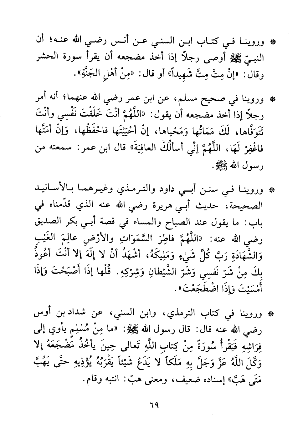 [[وروينا في كتاب ابن السني عن أنس رضي الله عنه؛ أن النبي صلى الله عليه وسلم أوصى رجلاً إذا أخذ مضجعه أن يقرأ سورة الحشر وقال: ((إن مت مت شهيداً)) أو قال: ((من أهل الجنة)).