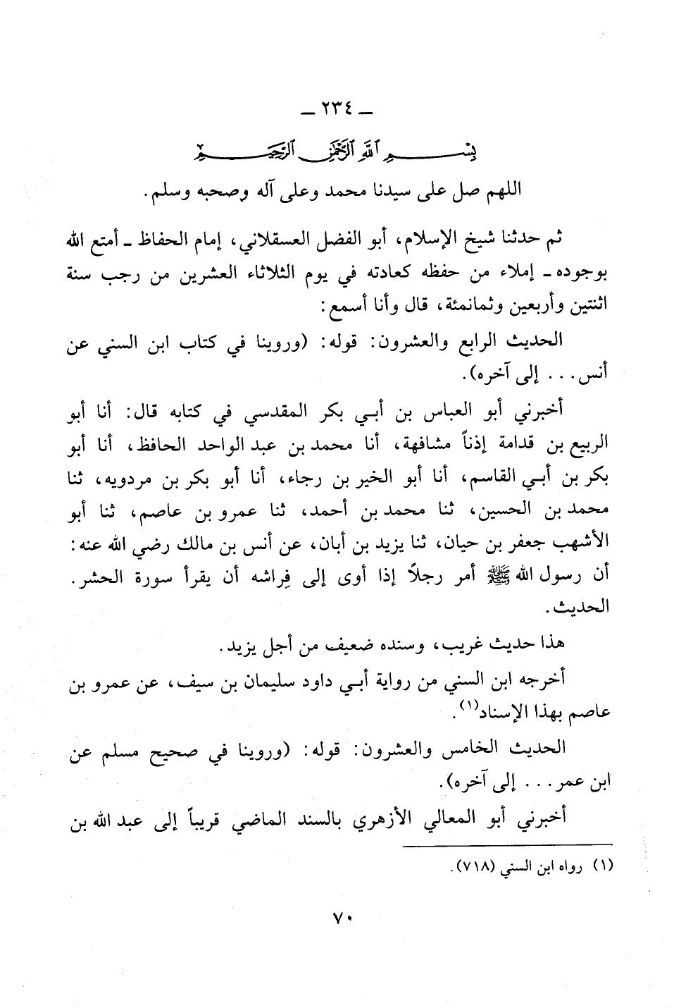 ثم حدثنا شيخ الإسلام، أبو الفضل العسقلاني، إمام الحفاظ -أمتع الله بوجوده- إملاء من حفظه كعادته في يوم الثلاثاء العشرين من رجب سنة اثنتين وأربعين وثمانمئة، قال وأنا أسمع: