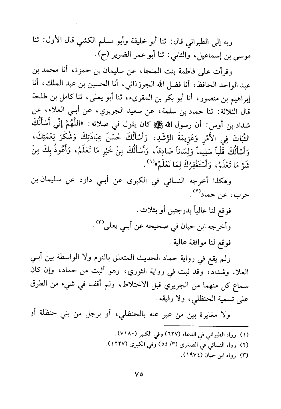 وقرأت على فاطمة بنت المنجا، عن سليمان بن حمزة، أنا محمد بن عبد الواحد الحافظ، أنا فضل الله الجوزذاني، أنا الحسين بن عبد الملك، أنا إبراهيم بن منصور، أنا أبو بكر بن المقرئ، ثنا أبو يعلى، ثنا كامل بن طلحة قال الثلاثة: ثنا حماد بن سلمة، عن سعيد الجريري، عن أبي العلاء، عن شداد بن أوس: أن رسول الله صلى الله عليه وسلم كان يقول في صلاته: ((اللهم إني أسألك الثبات في الأمر وعزيمة الرشد، وأسألك حسن عبادتك وشكر نعمتك، وأسألك قلباً سليماً ولساناً صادقاً، وأسألك من خير ما تعلم، وأعوذ بك من شر ما تعلم، وأستغفرك لما تعلم)).
