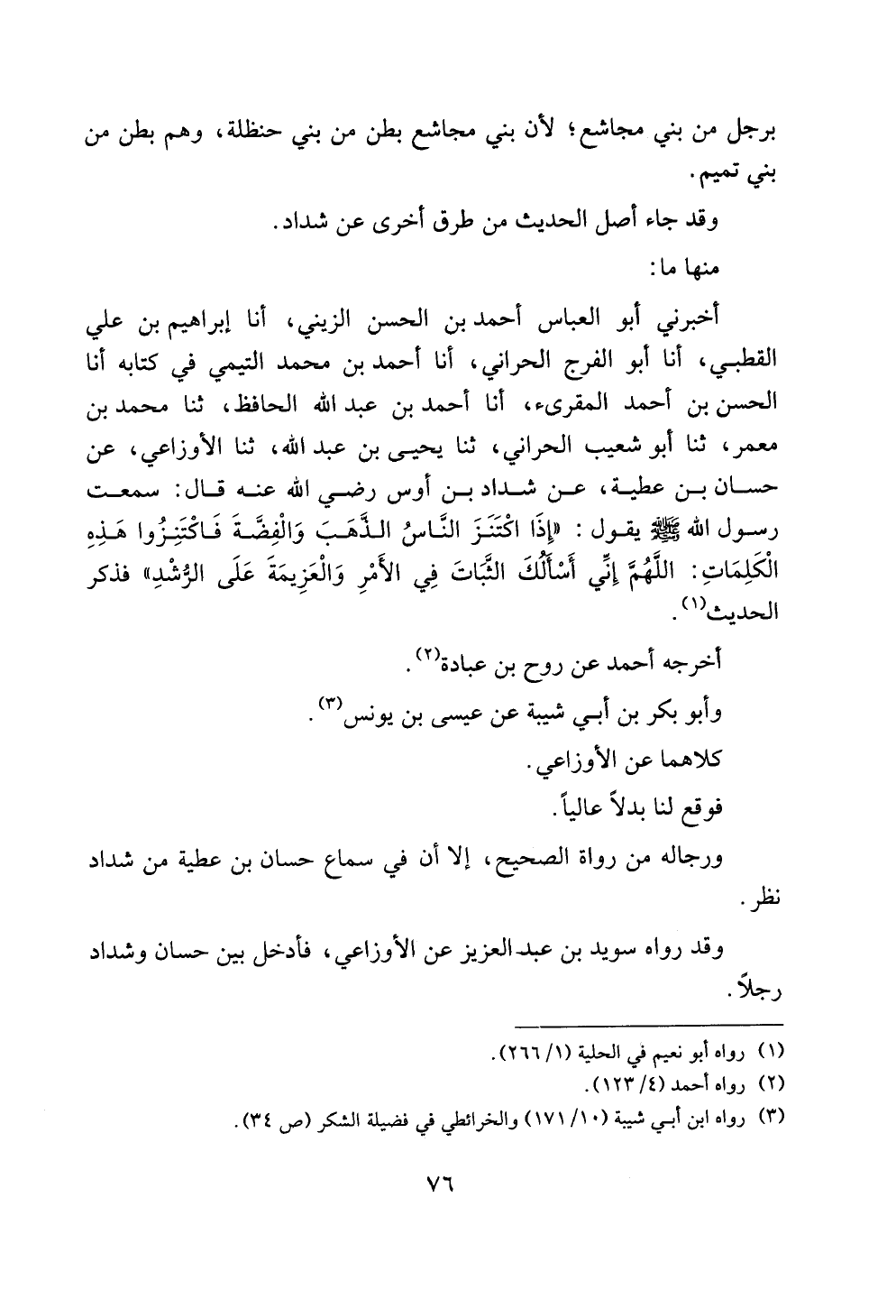 أخبرني أبو العباس أحمد بن الحسن الزيني، أنا إبراهيم بن علي القطبي، أنا أبو الفرج الحراني، أنا أحمد بن محمد التيمي في كتابه أنا الحسن بن أحمد المقرئ، أنا أحمد بن عبد الله الحافظ، ثنا محمد بن معمر، ثنا أبو شعيب الحراني، ثنا يحيى بن عبد الله، ثنا الأوزاعي، عن حسان بن عطية، عن شداد بن أوس رضي الله عنه قال: سمعت رسول الله صلى الله عليه وسلم يقول: ((إذا اكتنز الناس الذهب والفضة فاكتنزوا هذه الكلمات: اللهم إني أسألك الثبات في الأمر والعزيمة على الرشد)) فذكر الحديث.
