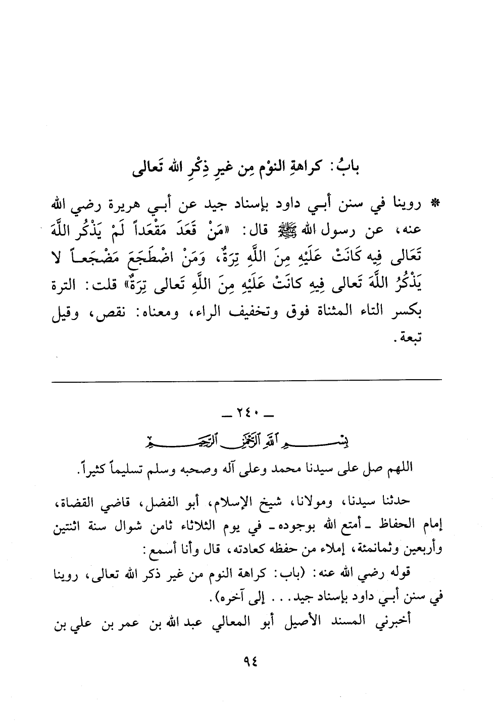 قوله رضي الله عنه: (باب: كراهة النوم من غير ذكر الله تعالى، روينا في سنن أبي داود بإسناد جيد .. .. إلى آخره)).